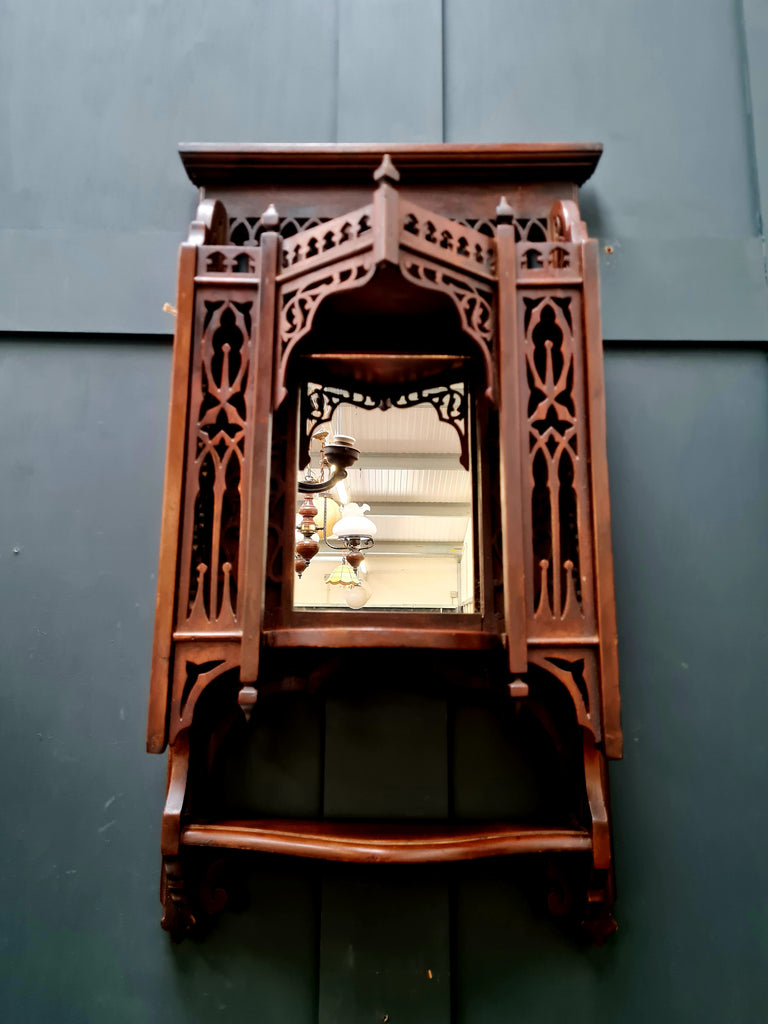 Antique aesthetic movement style fret cut mahogany tiered mirror shelf