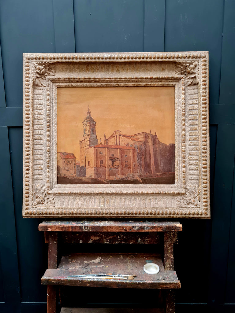 Antique Early 20th Century Framed Oil Painting on Canvas - Sta. María de la Asunción y del Manzano Church, Spain
