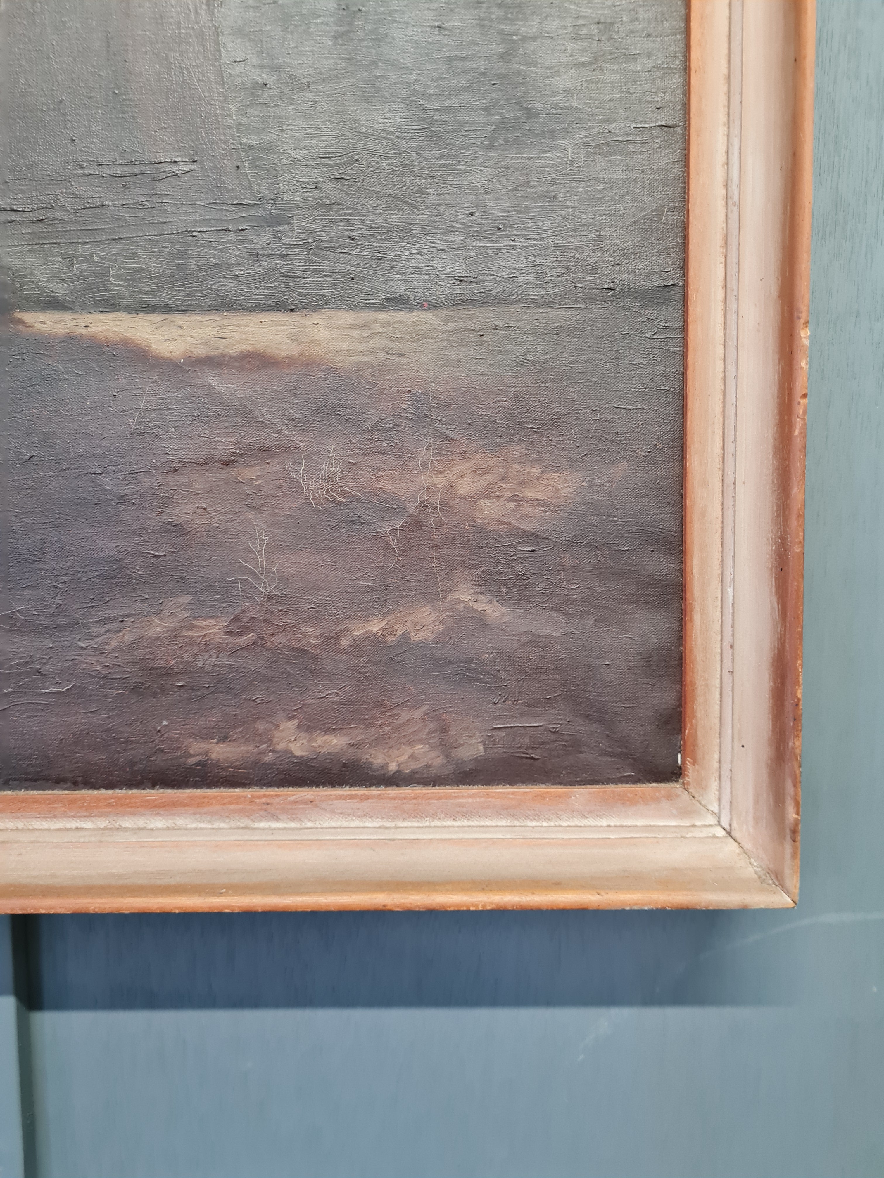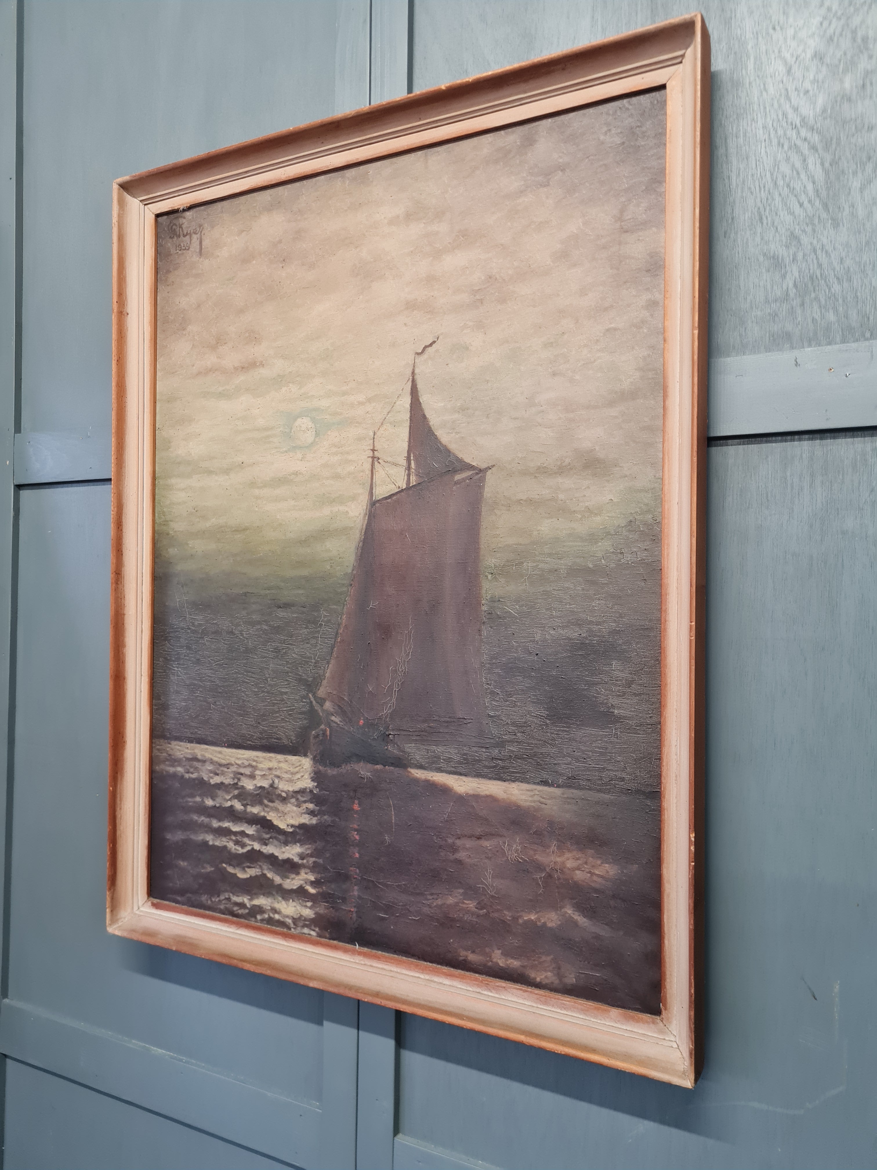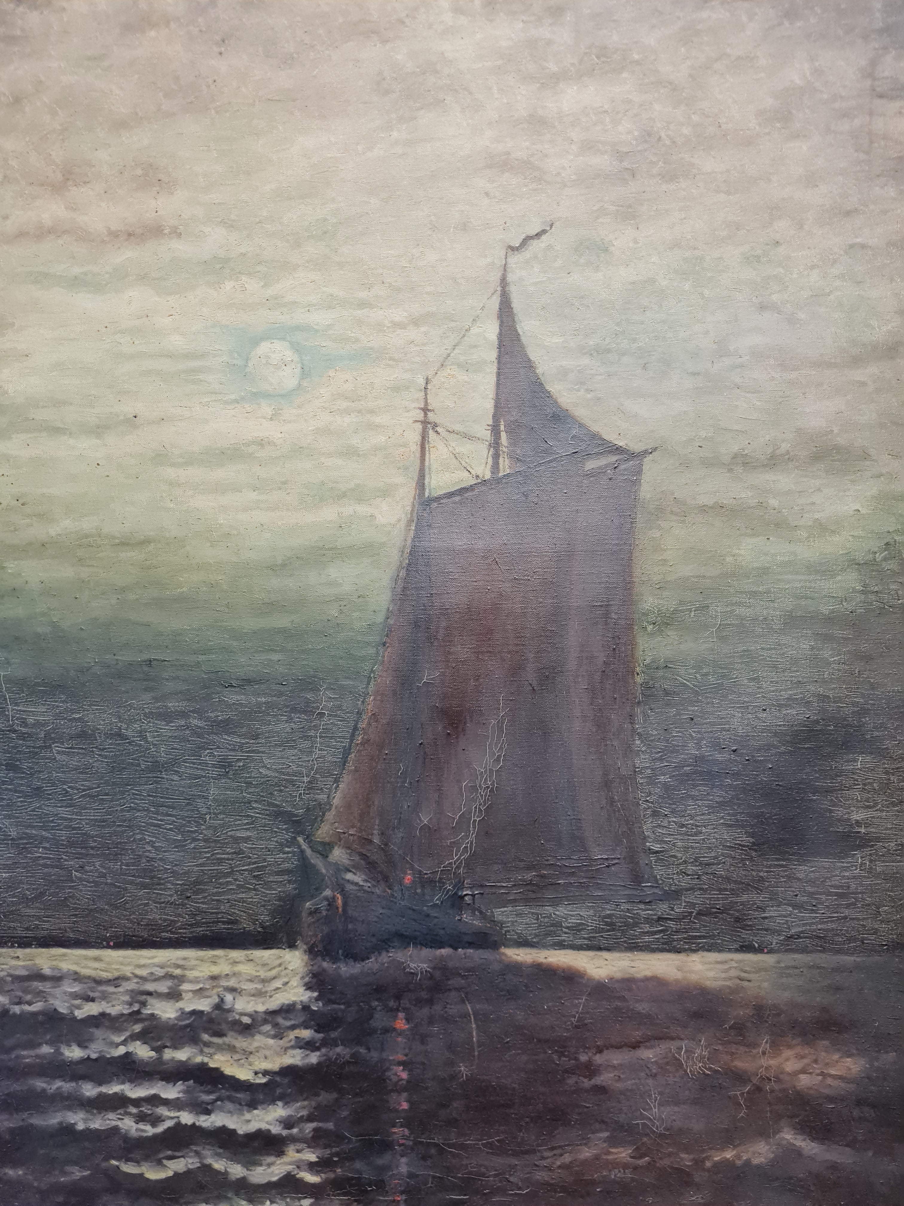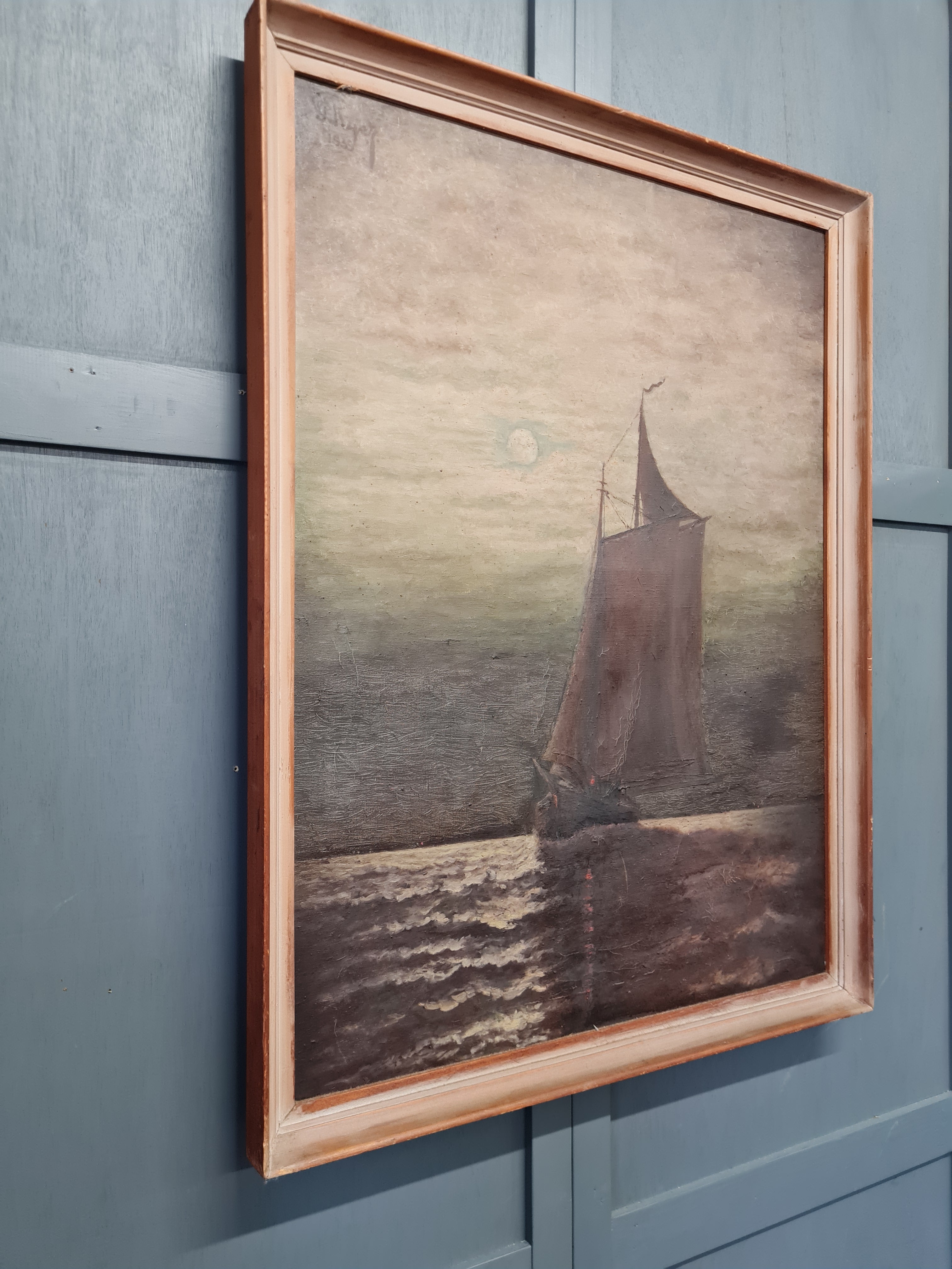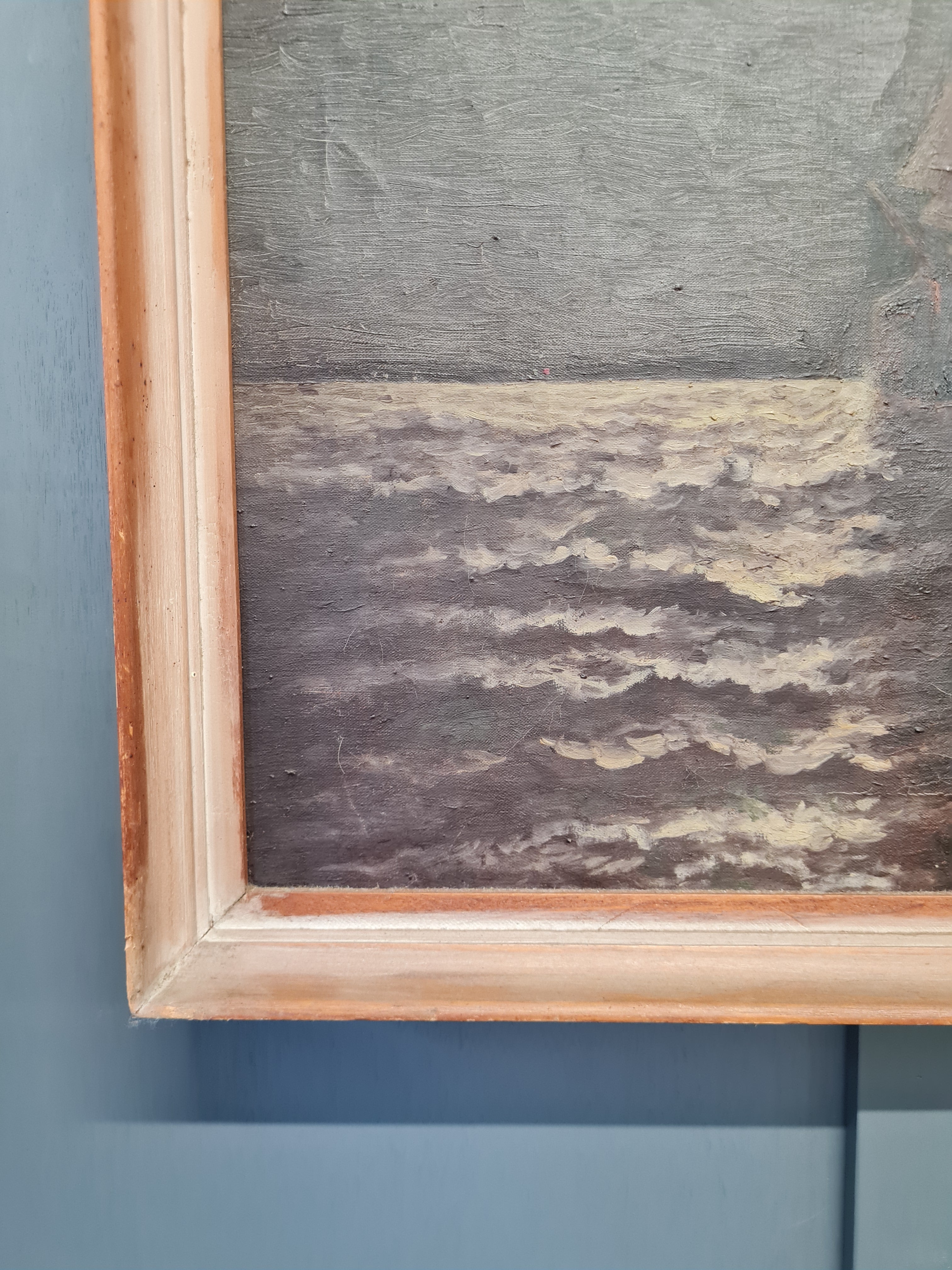 Painted in 1939 and retaining its original period character, the work shows confident handling of light and reflection, with calm water, softened horizons and a quietly evocative nocturnal mood. The style deliberately echoes 19th-century seascape traditions, a conservative but skilled approach still favoured by maritime painters in the interwar years.