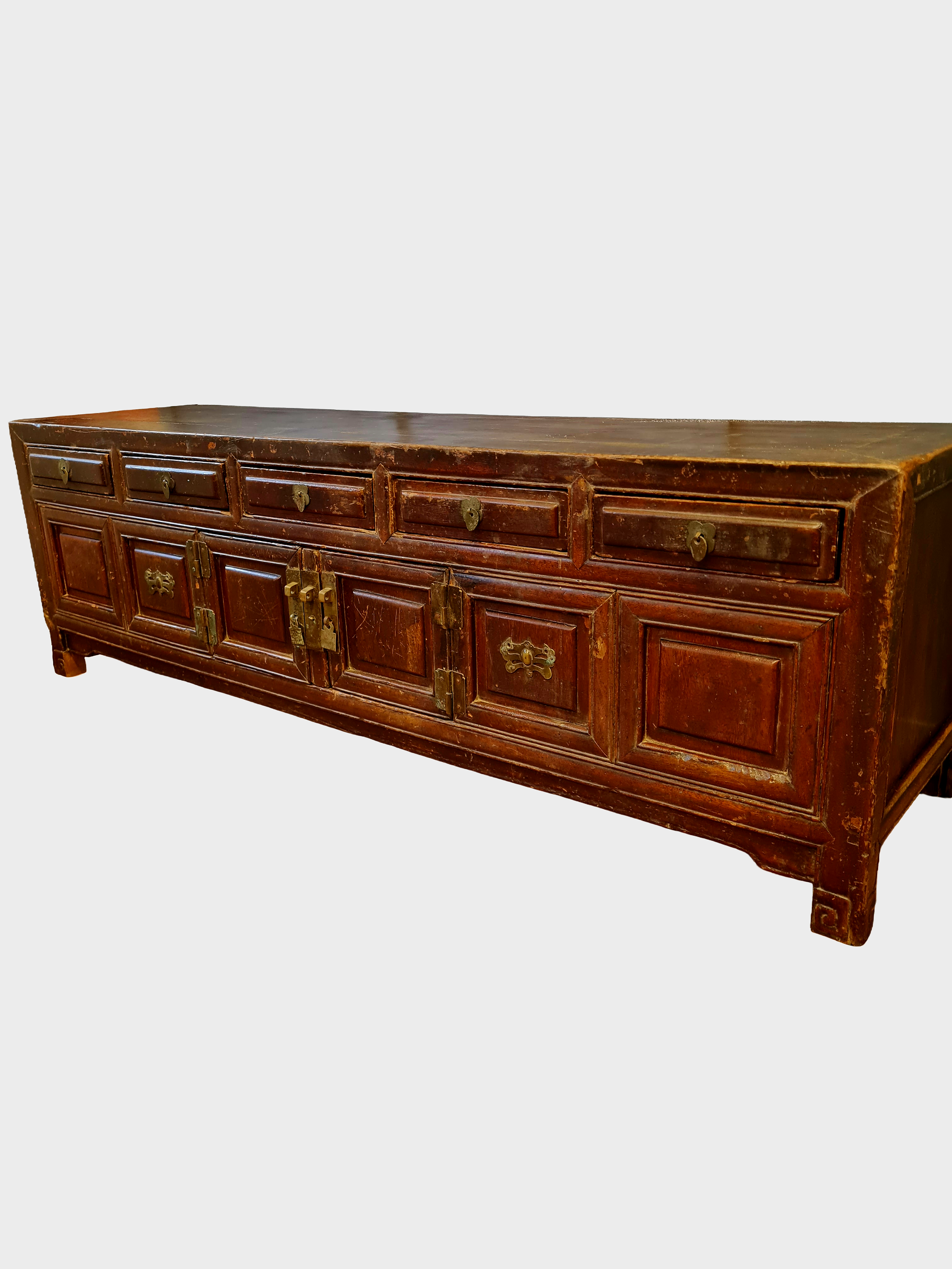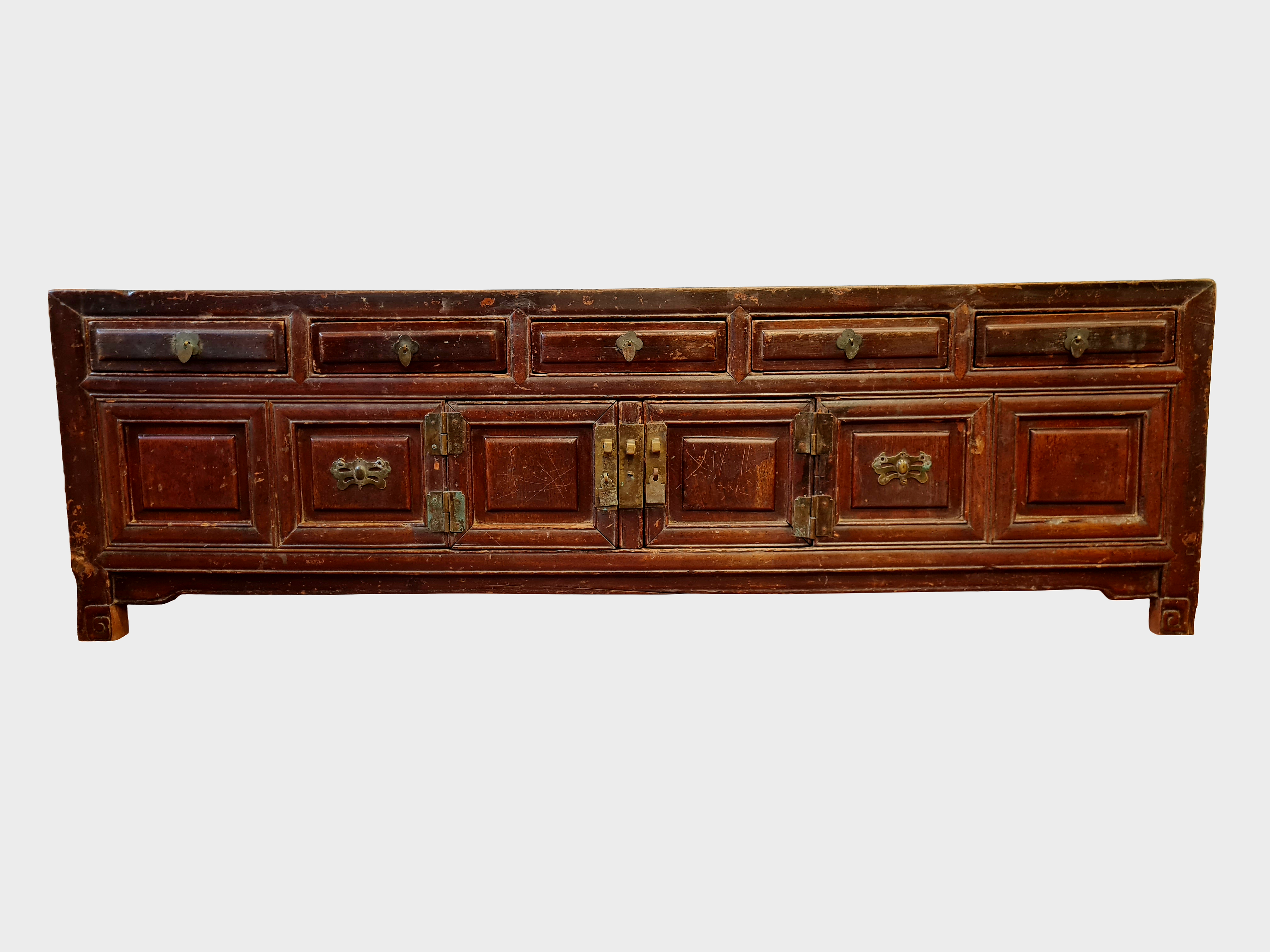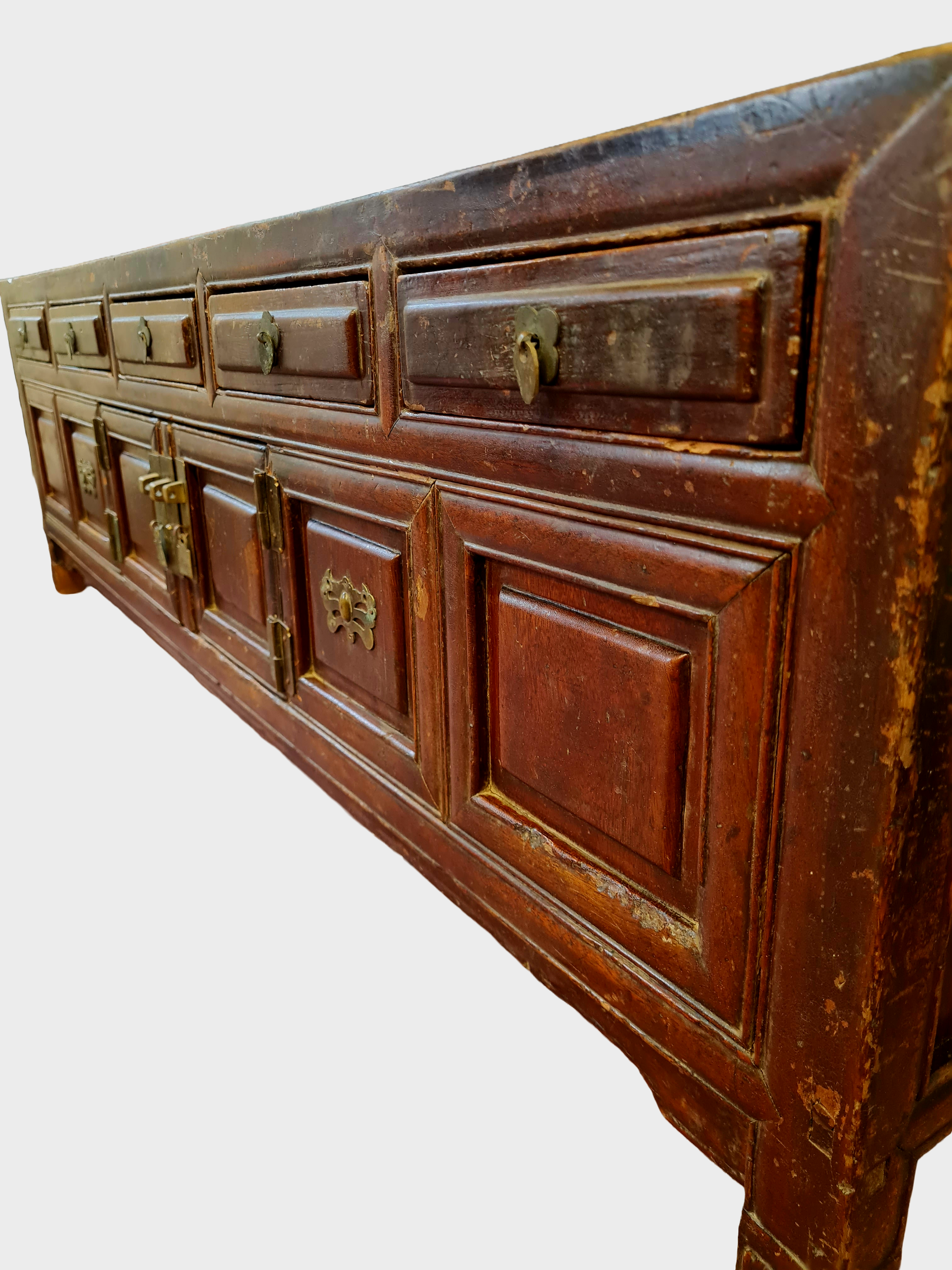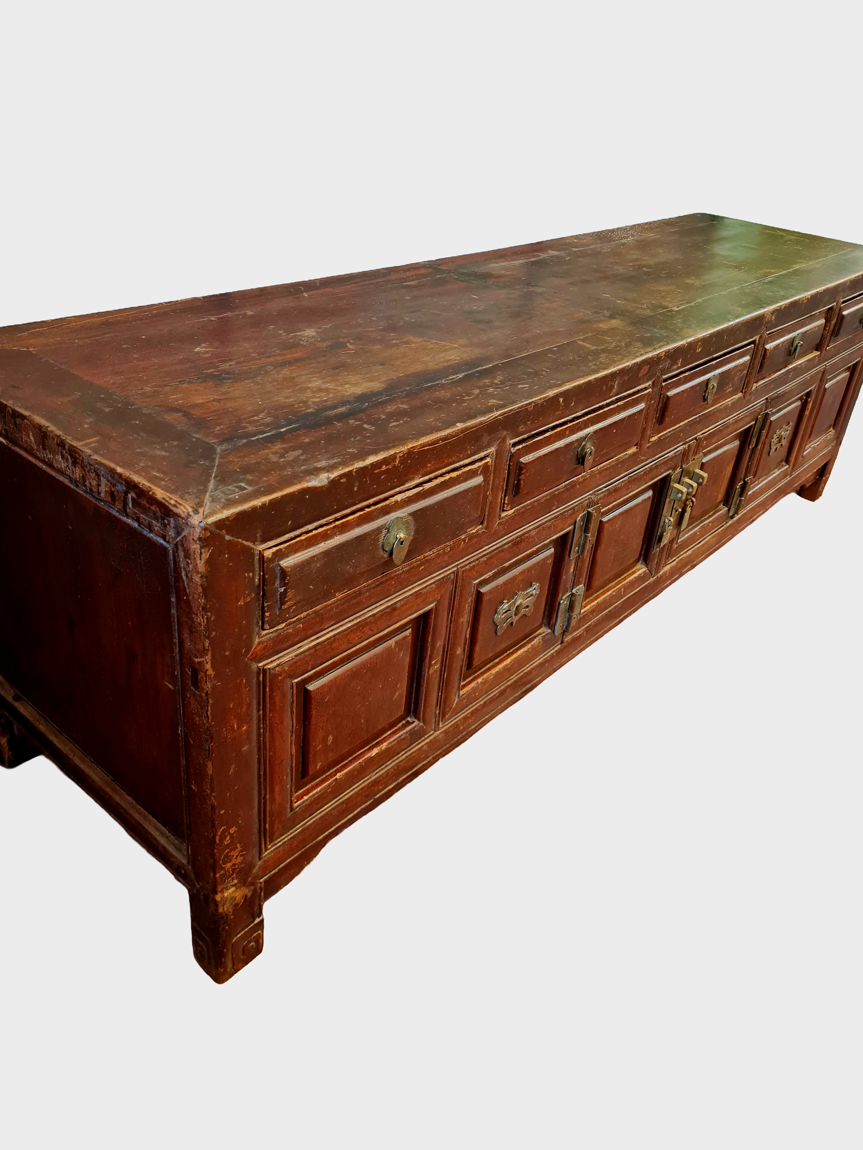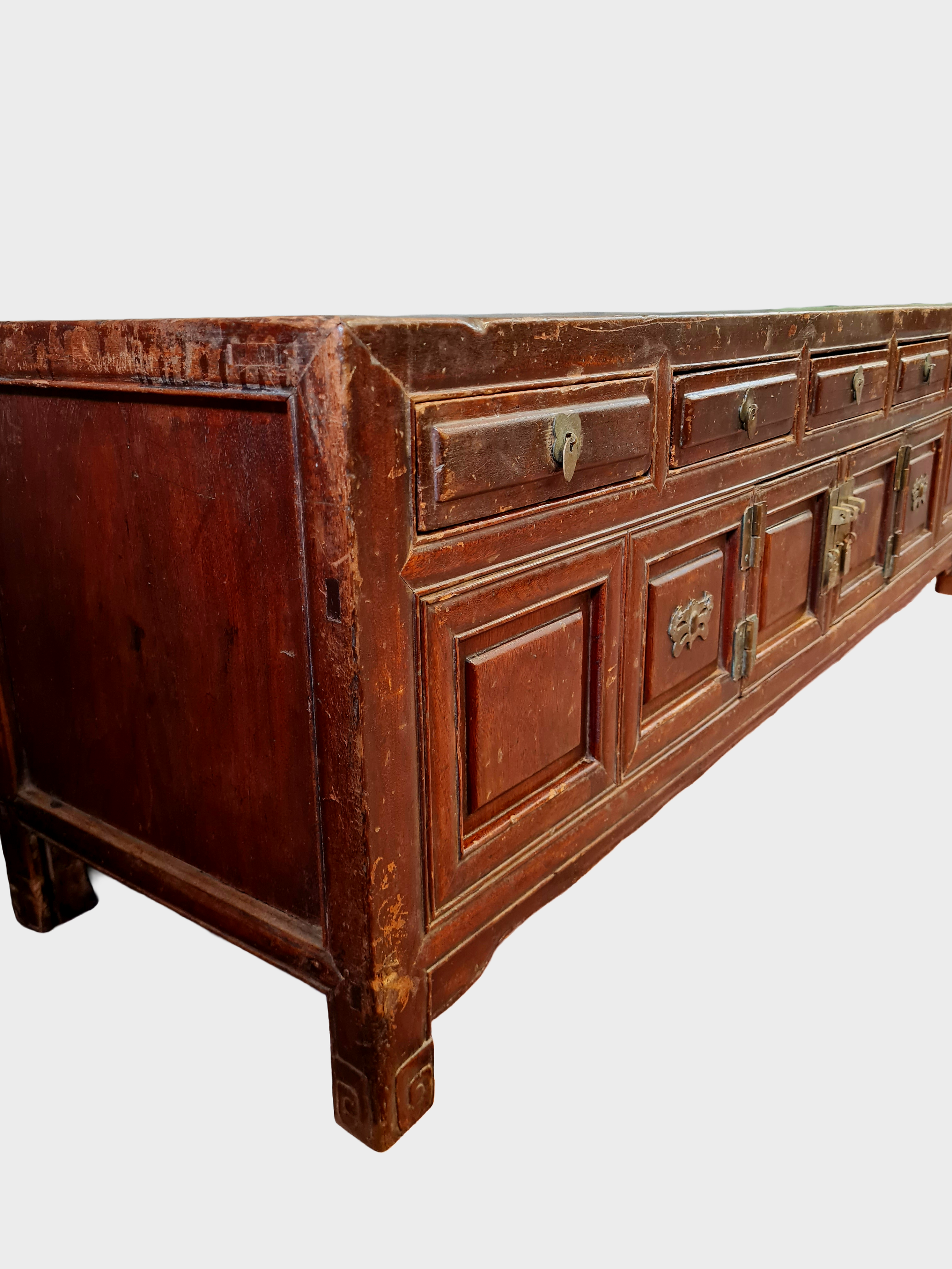 The cabinet features a traditional arrangement of shallow upper drawers above panelled cupboard doors, all retaining their original brass fittings. The low, elongated proportions are characteristic of kang tables and platform furniture, originally used in domestic interiors for storage beside raised beds or seating platforms.