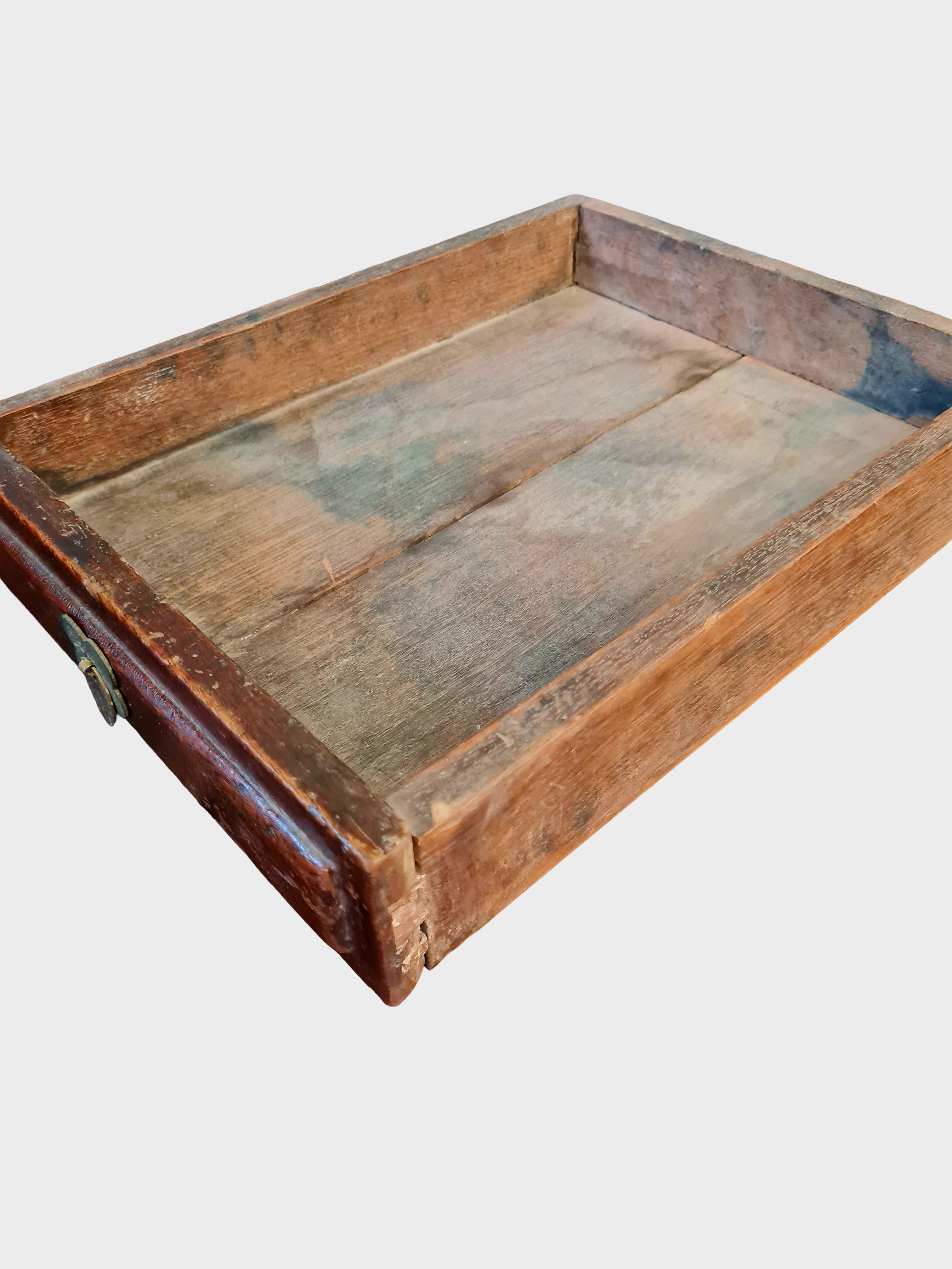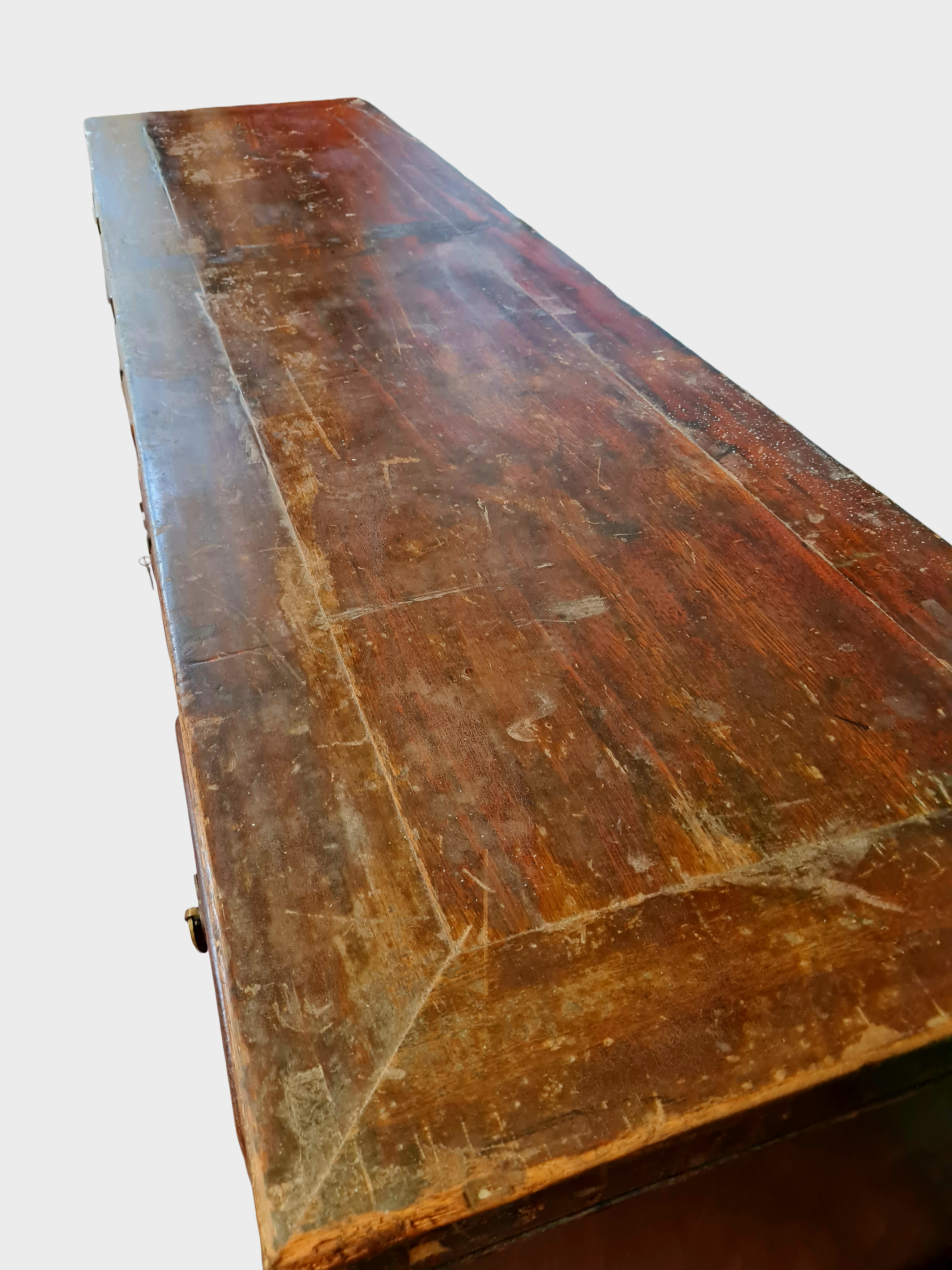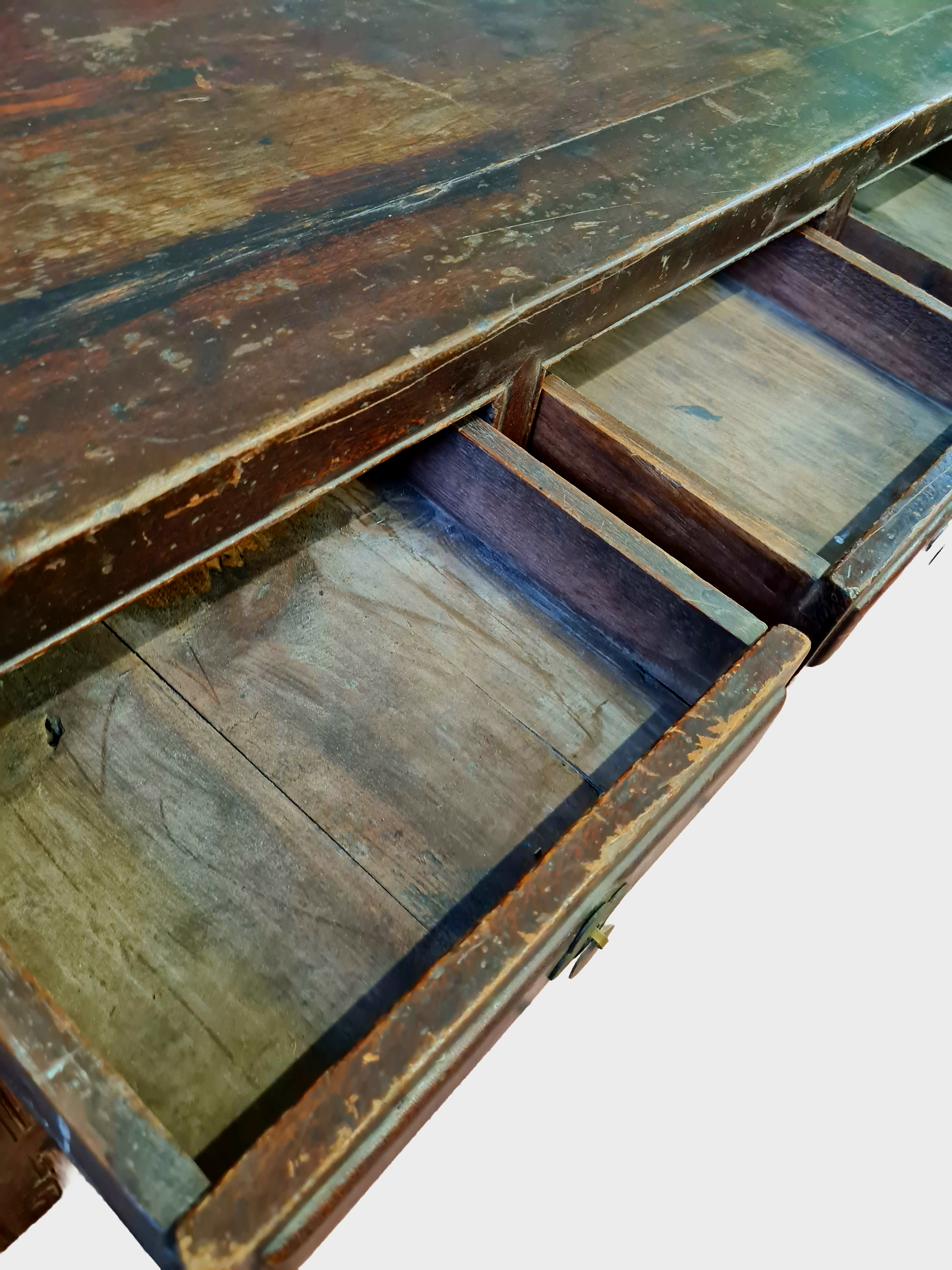 The surface shows heavy/honest wear, oxidation and patina consistent with age, with no modern finishes or artificial distressing. Drawer interiors reveal hand-prepared timbers and traditional construction throughout.
