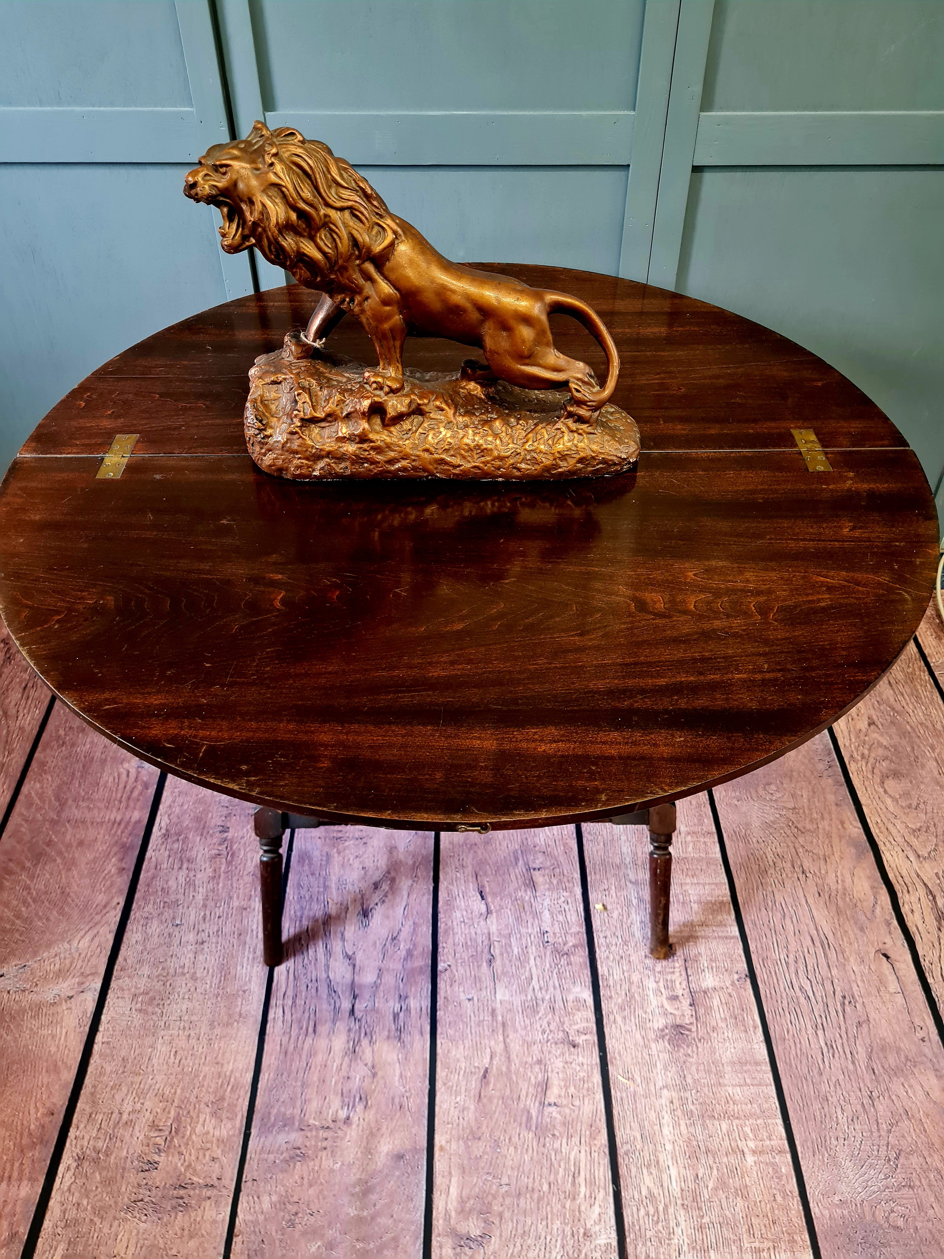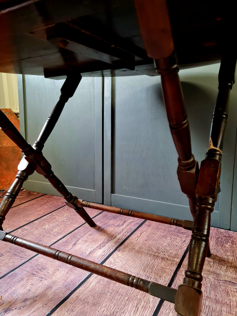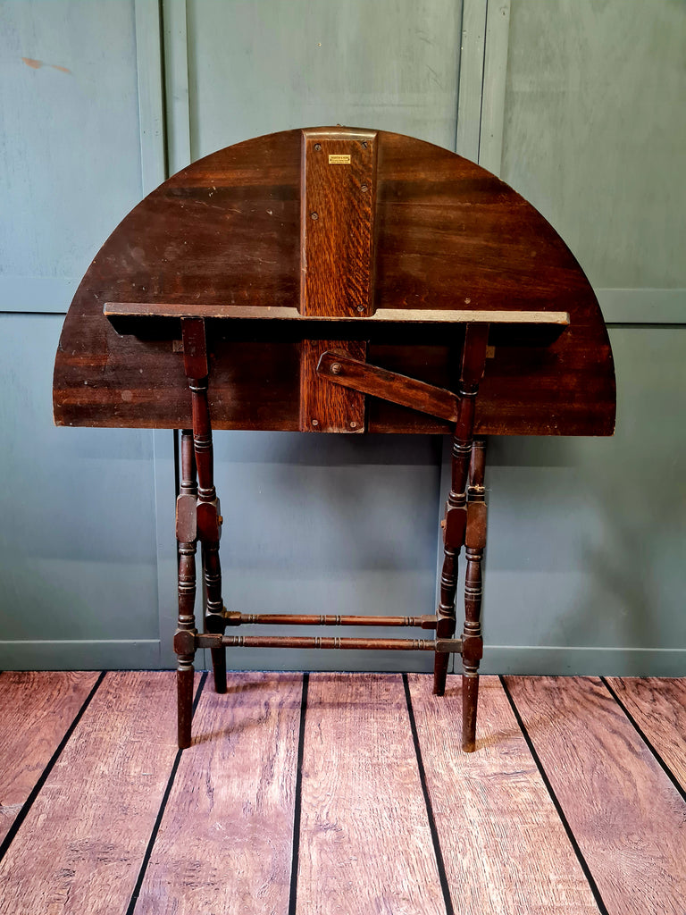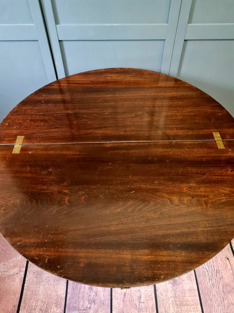 Oak veneer circular top, mounted on a turned oak base with folding supports and original brass hinges. Designed for practicality and style, it folds neatly for storage or travel — a hallmark of refined 19th-century craftsmanship.