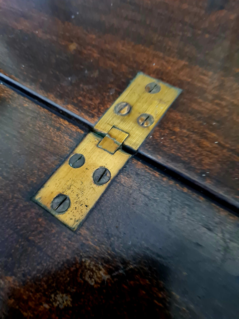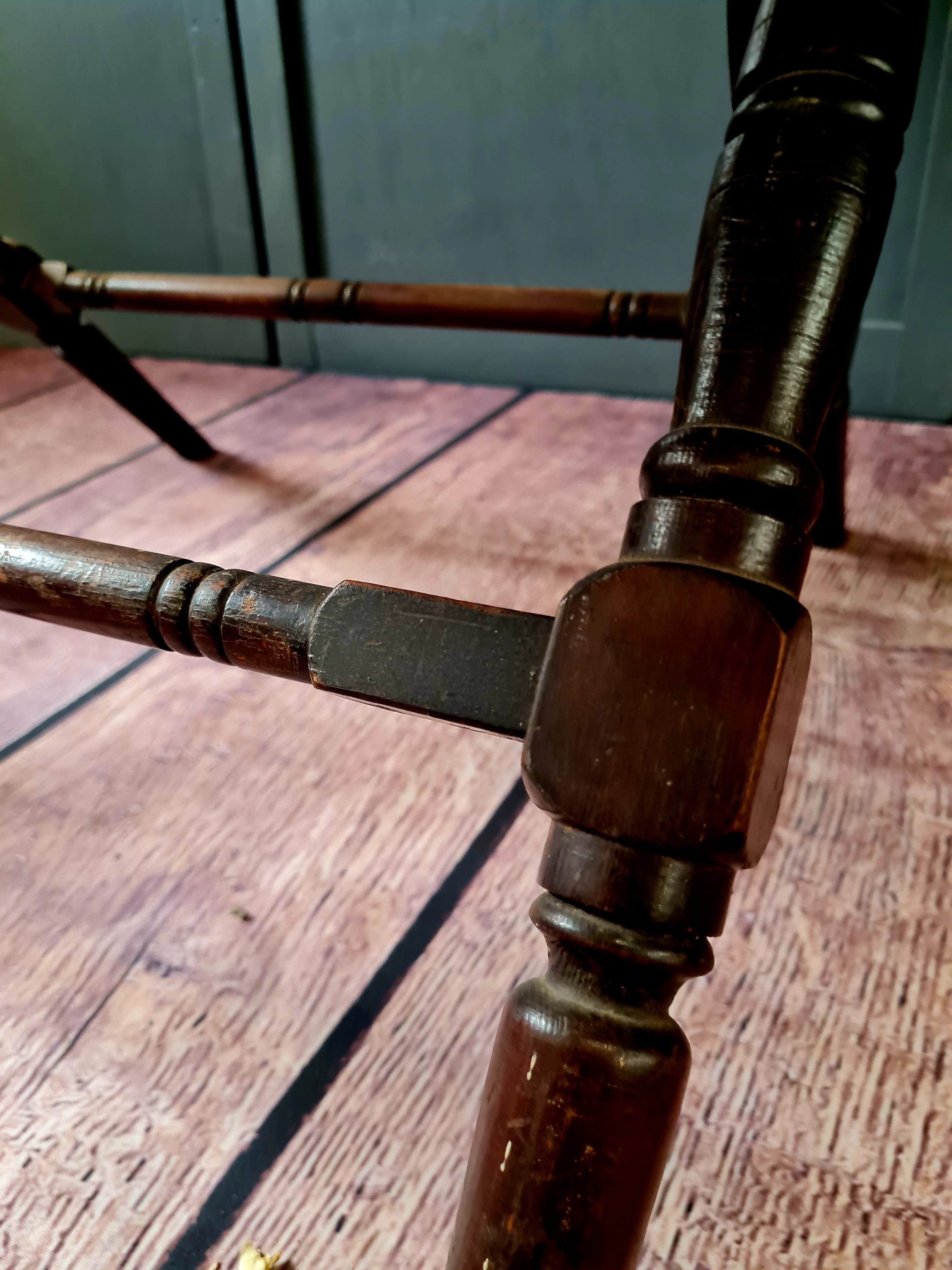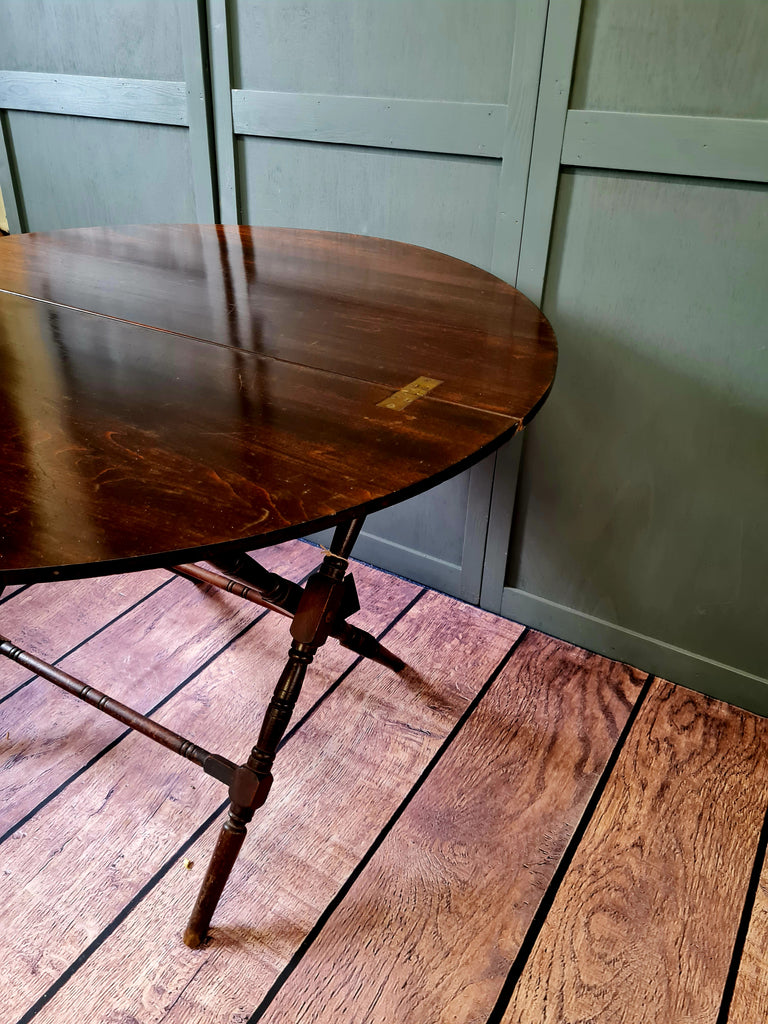 Oak veneer circular top, mounted on a turned oak base with folding supports and original brass hinges. Designed for practicality and style, it folds neatly for storage or travel — a hallmark of refined 19th-century craftsmanship.