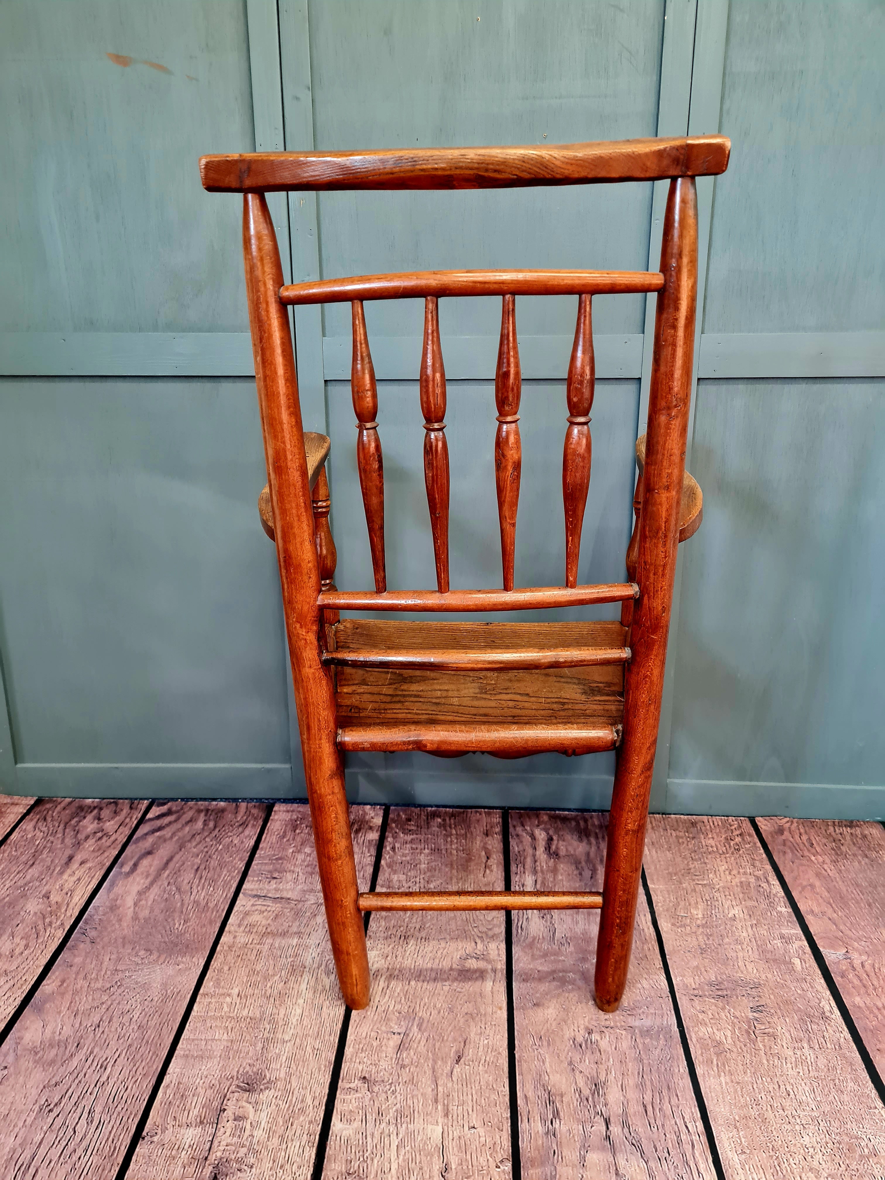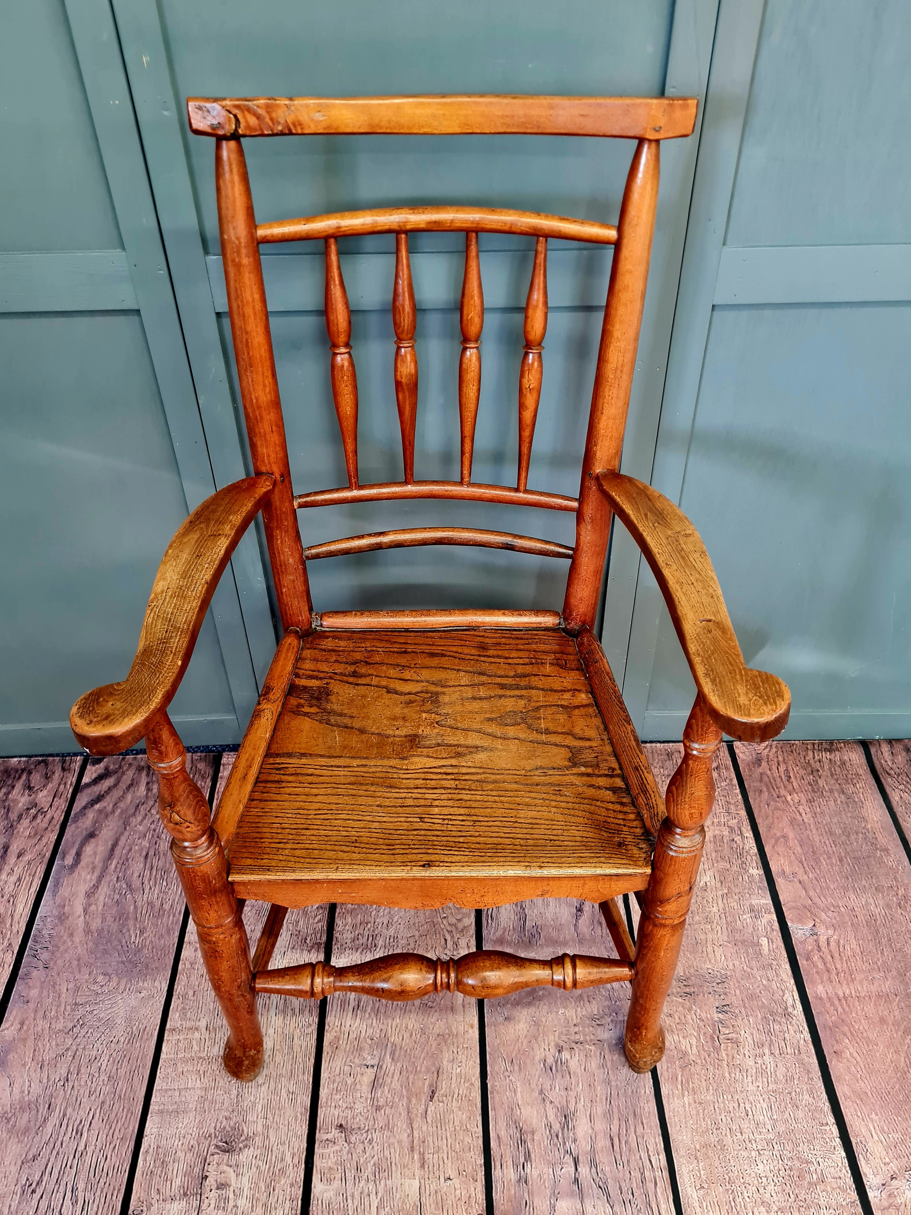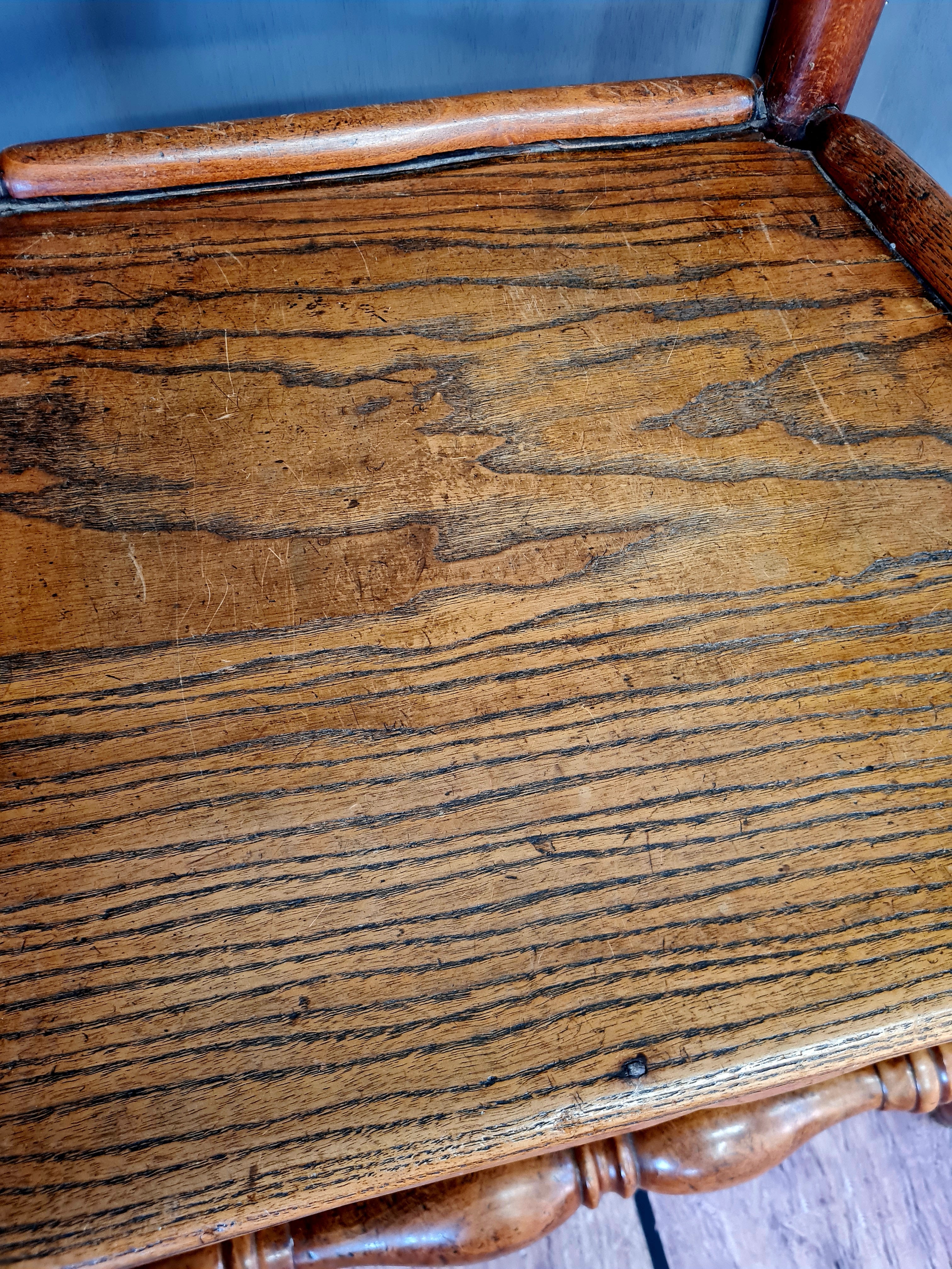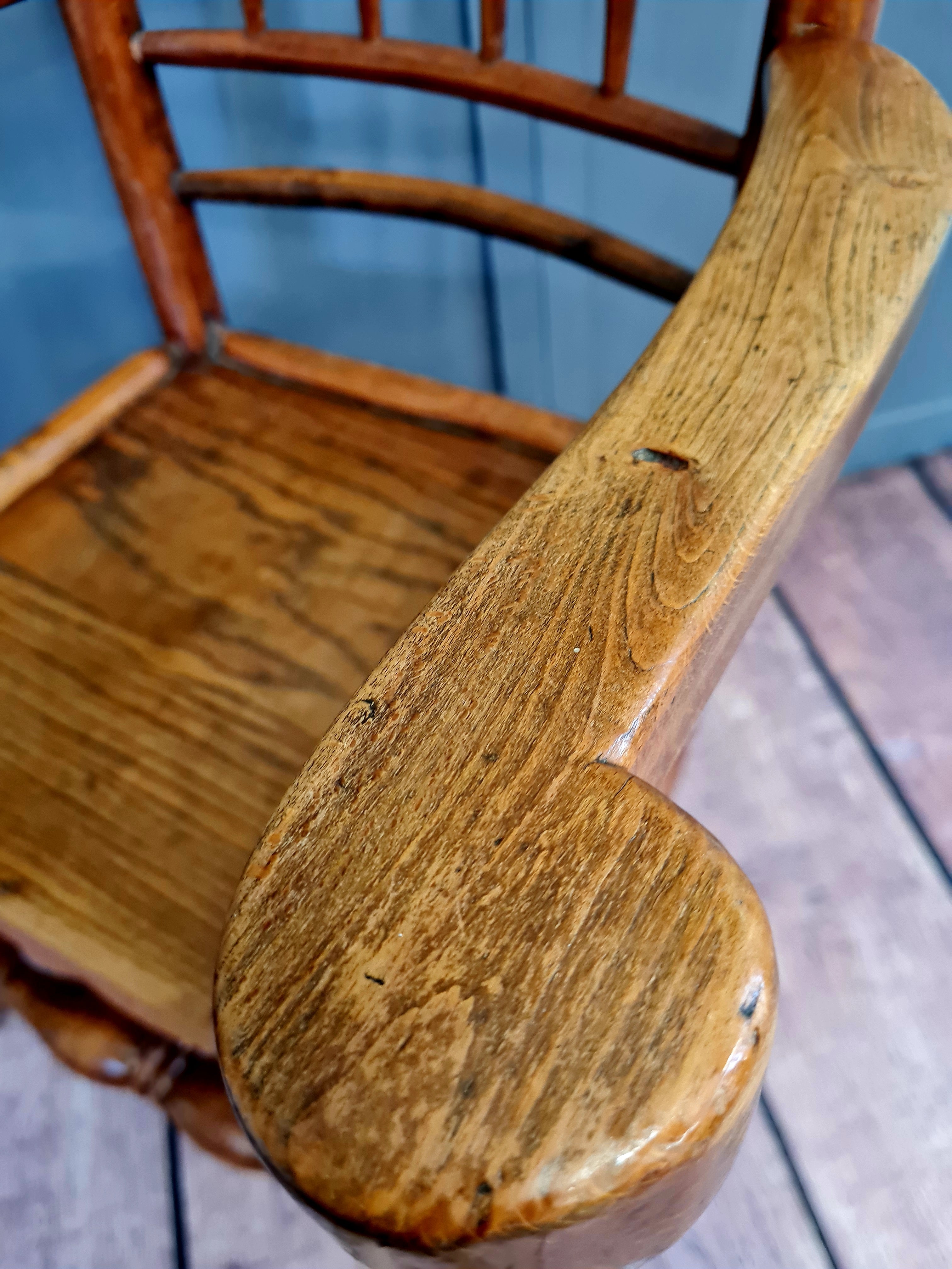 Georgian Windsor armchair, circa 1800. Constructed primarily of elm, with a single-board elm seat showing strong grain and original surface. Turned spindles, legs, and stretchers in the traditional Windsor manner, with shaped armrests.