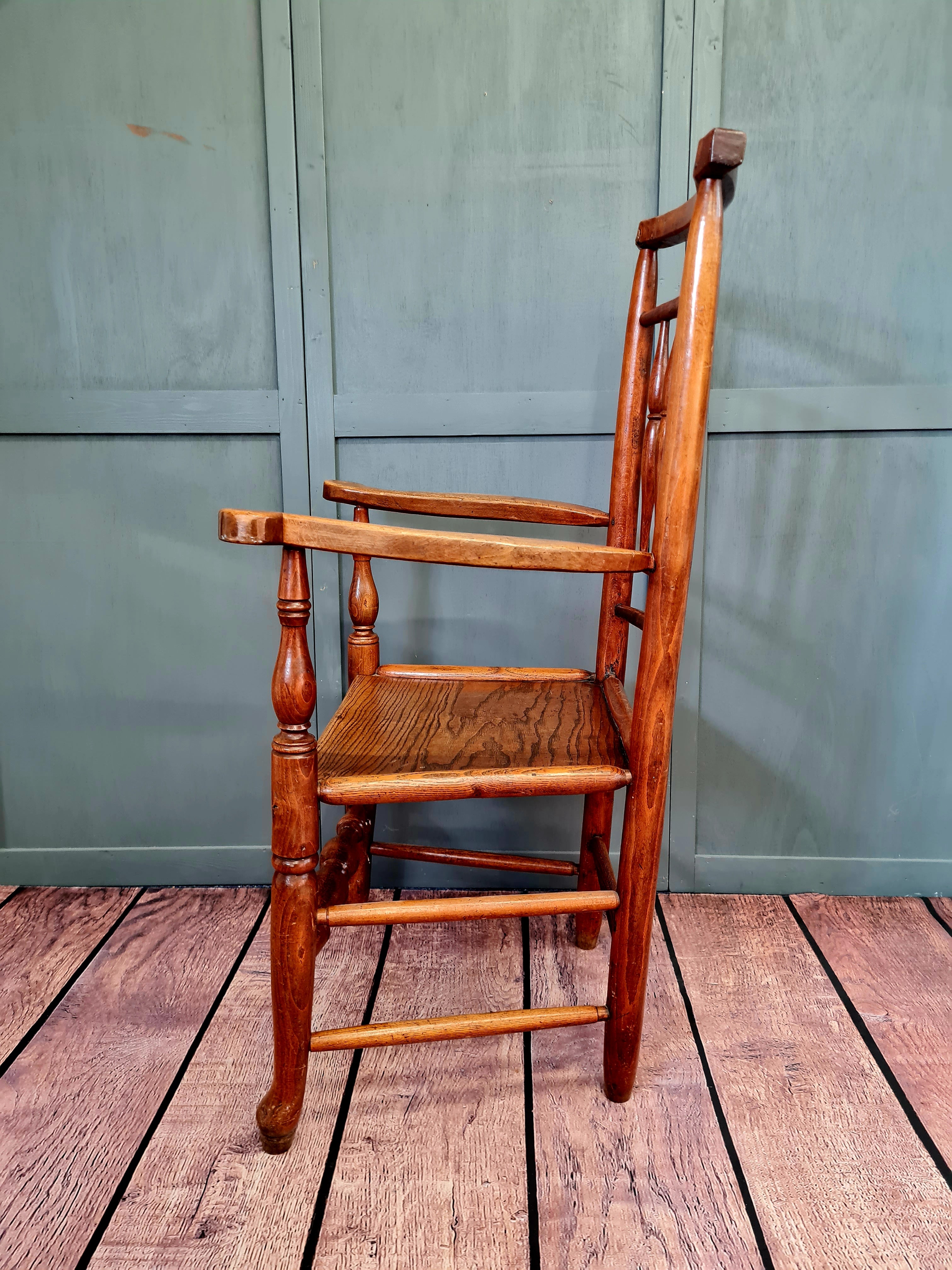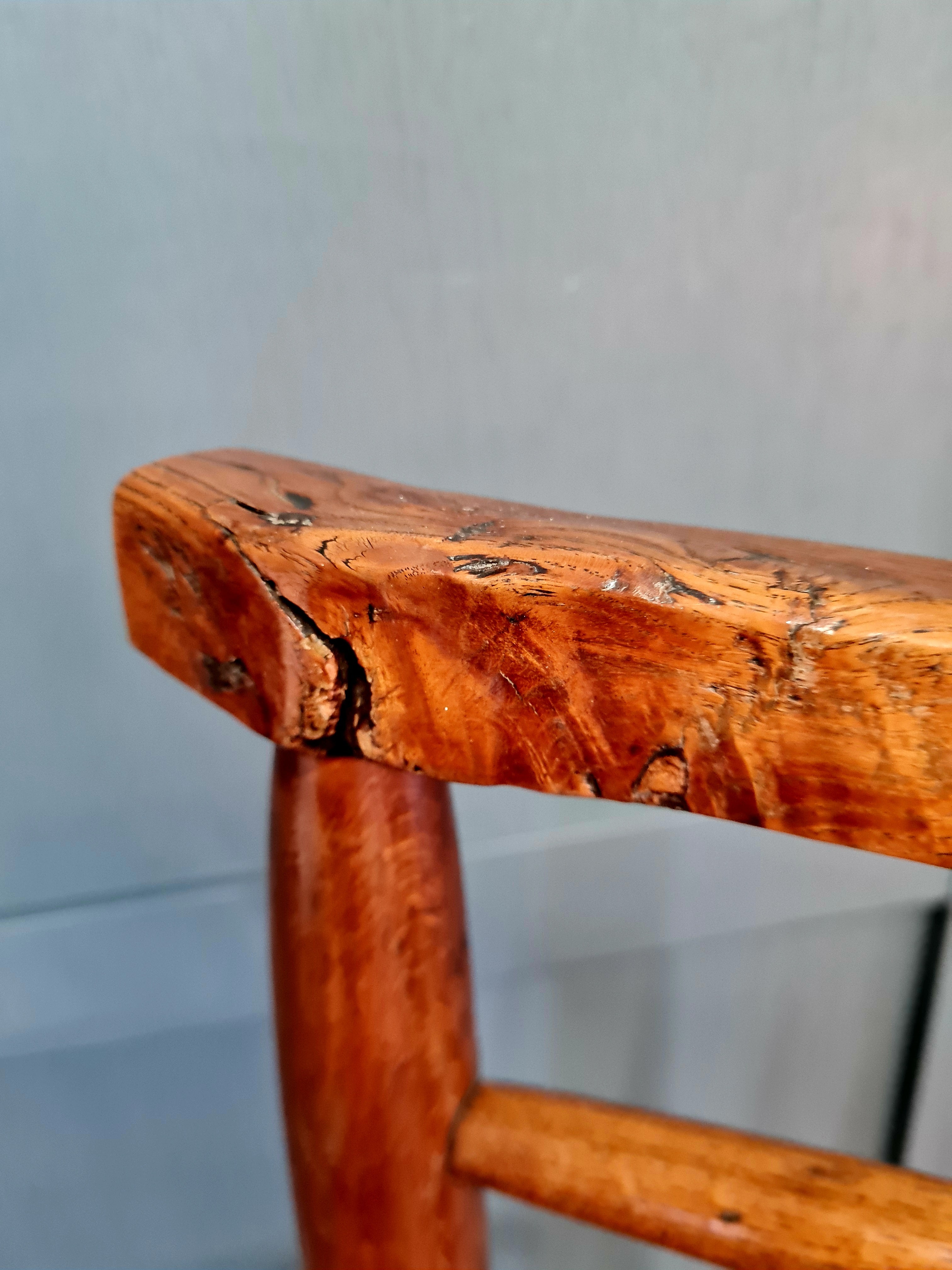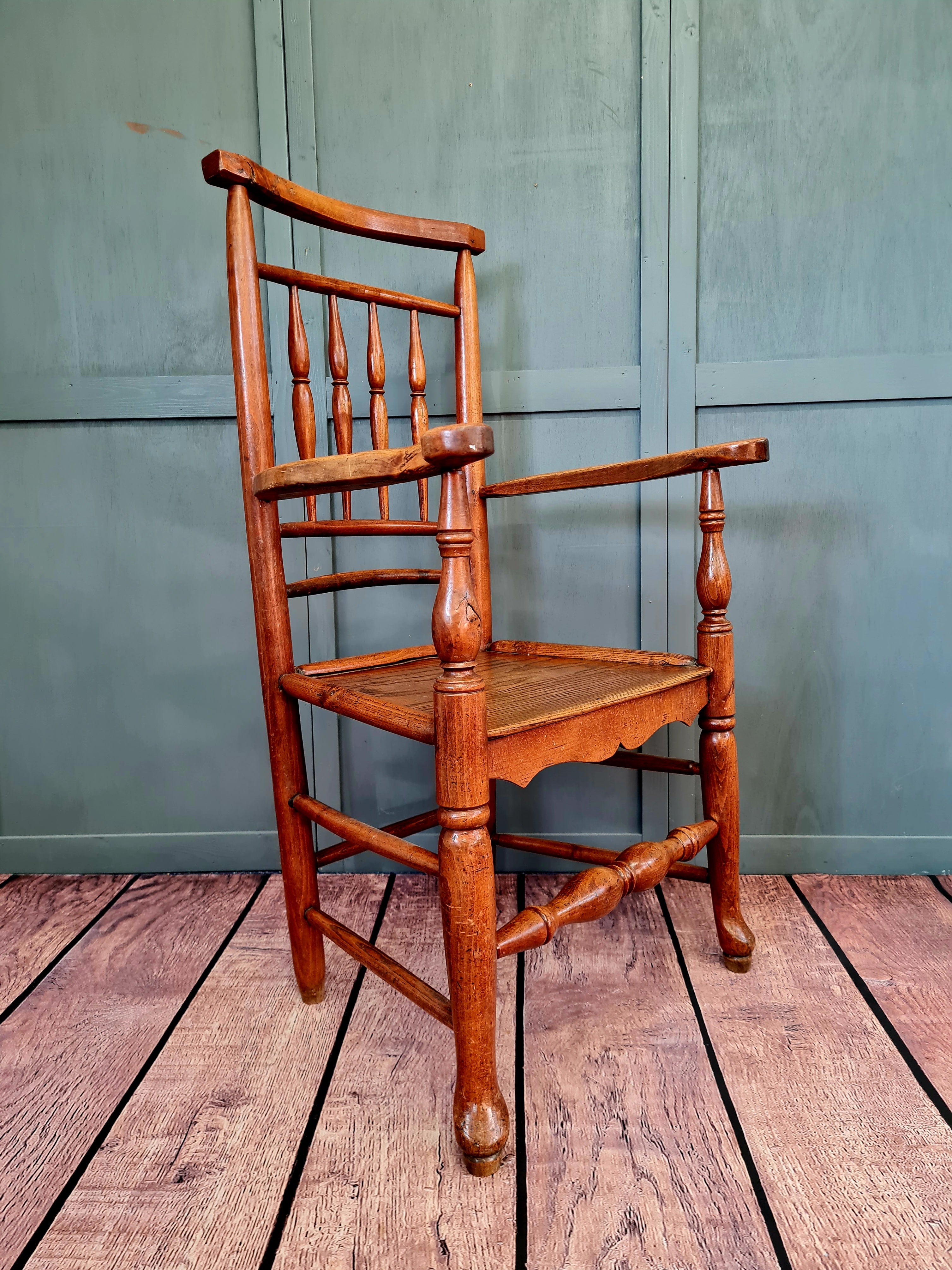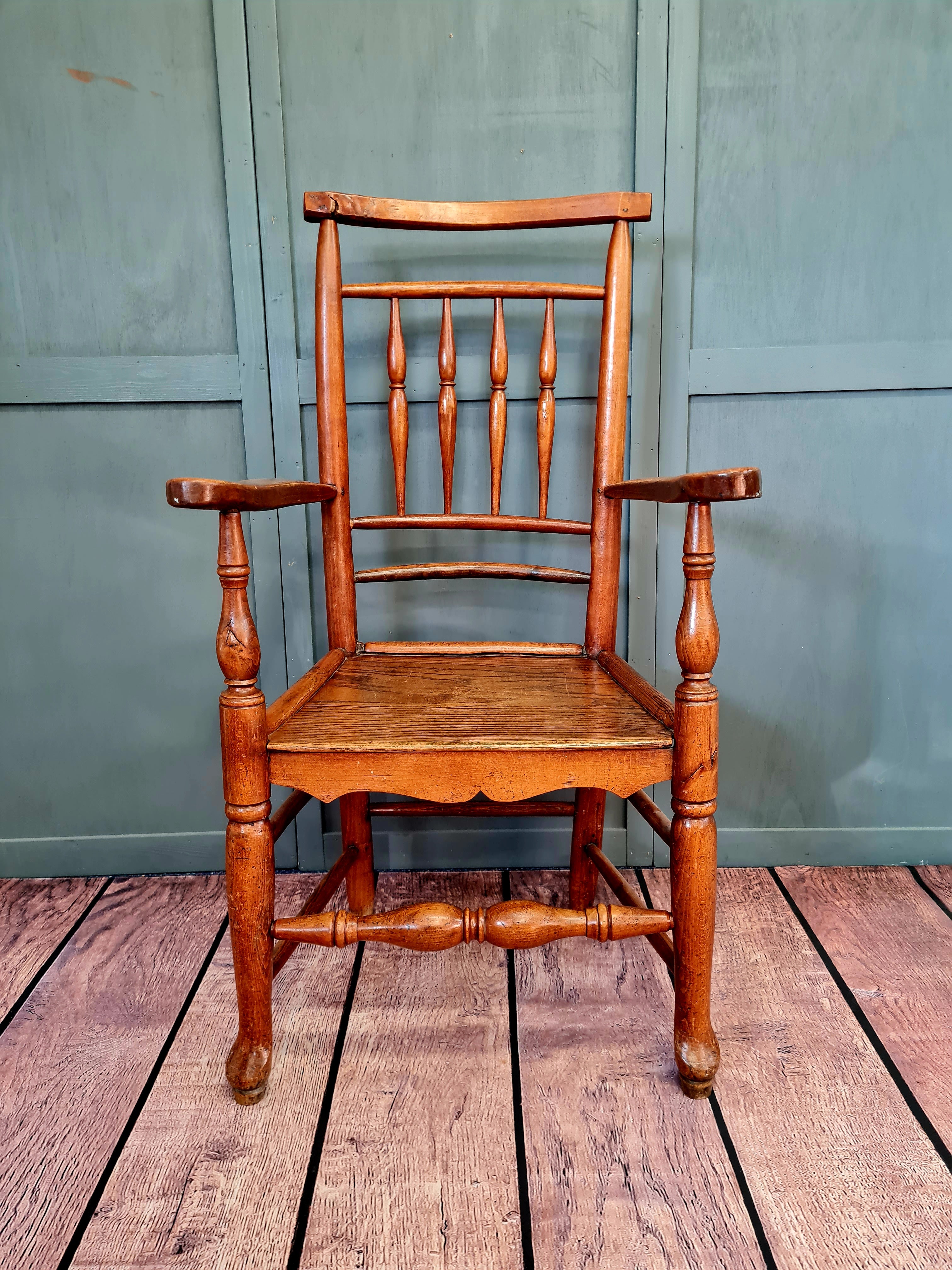 Georgian Windsor armchair, circa 1800. Constructed primarily of elm, with a single-board elm seat showing strong grain and original surface. Turned spindles, legs, and stretchers in the traditional Windsor manner, with shaped armrests.