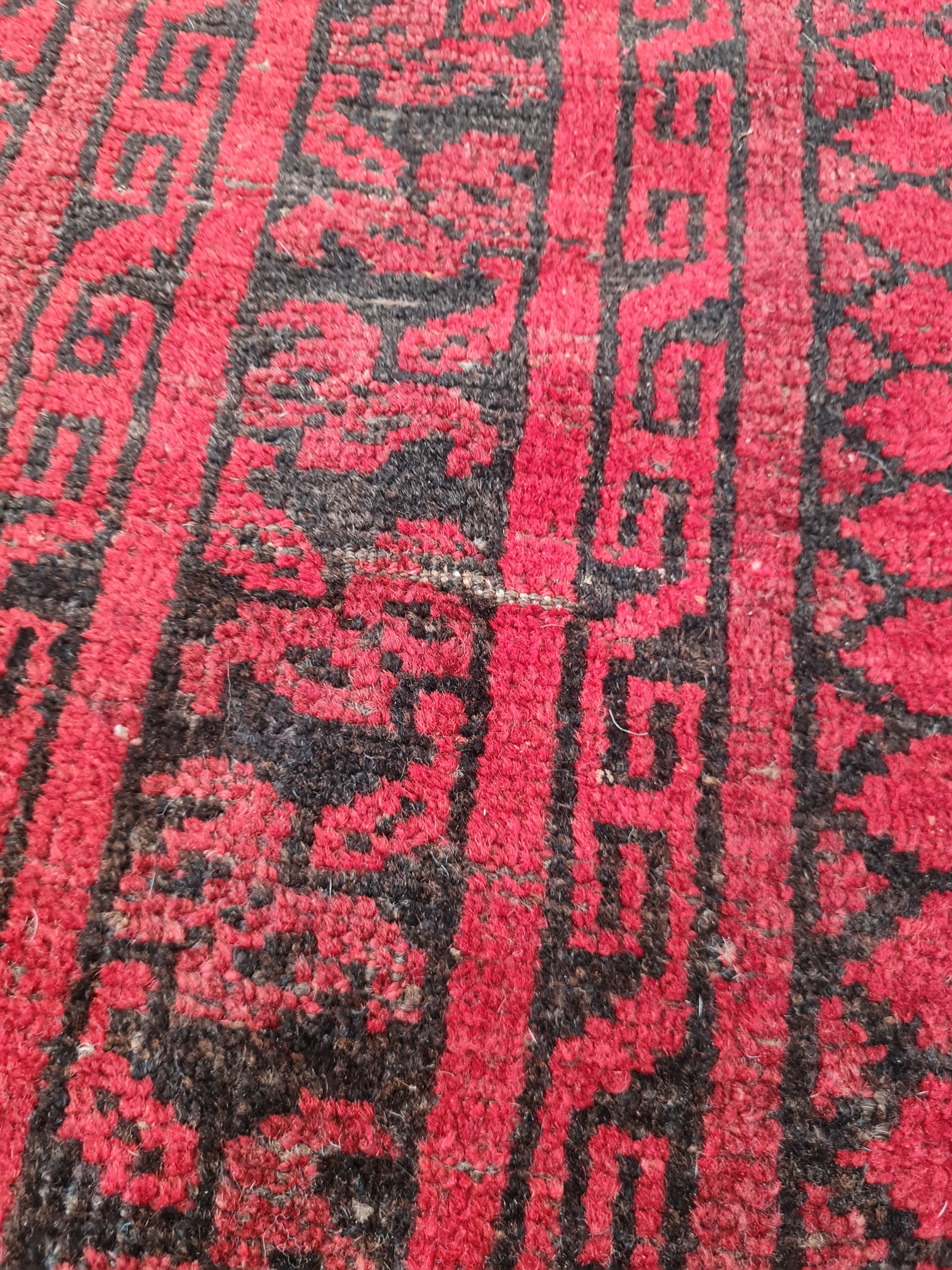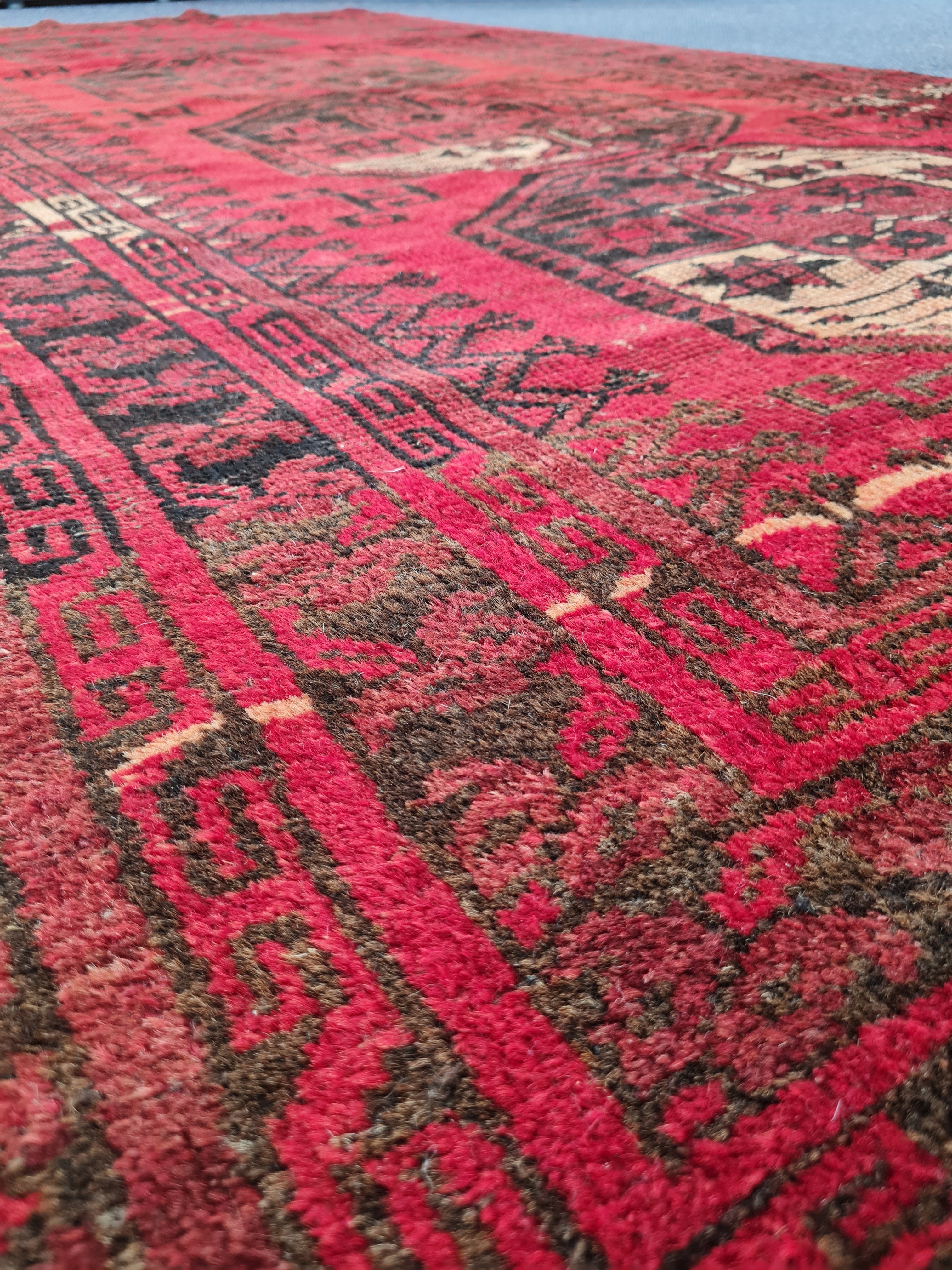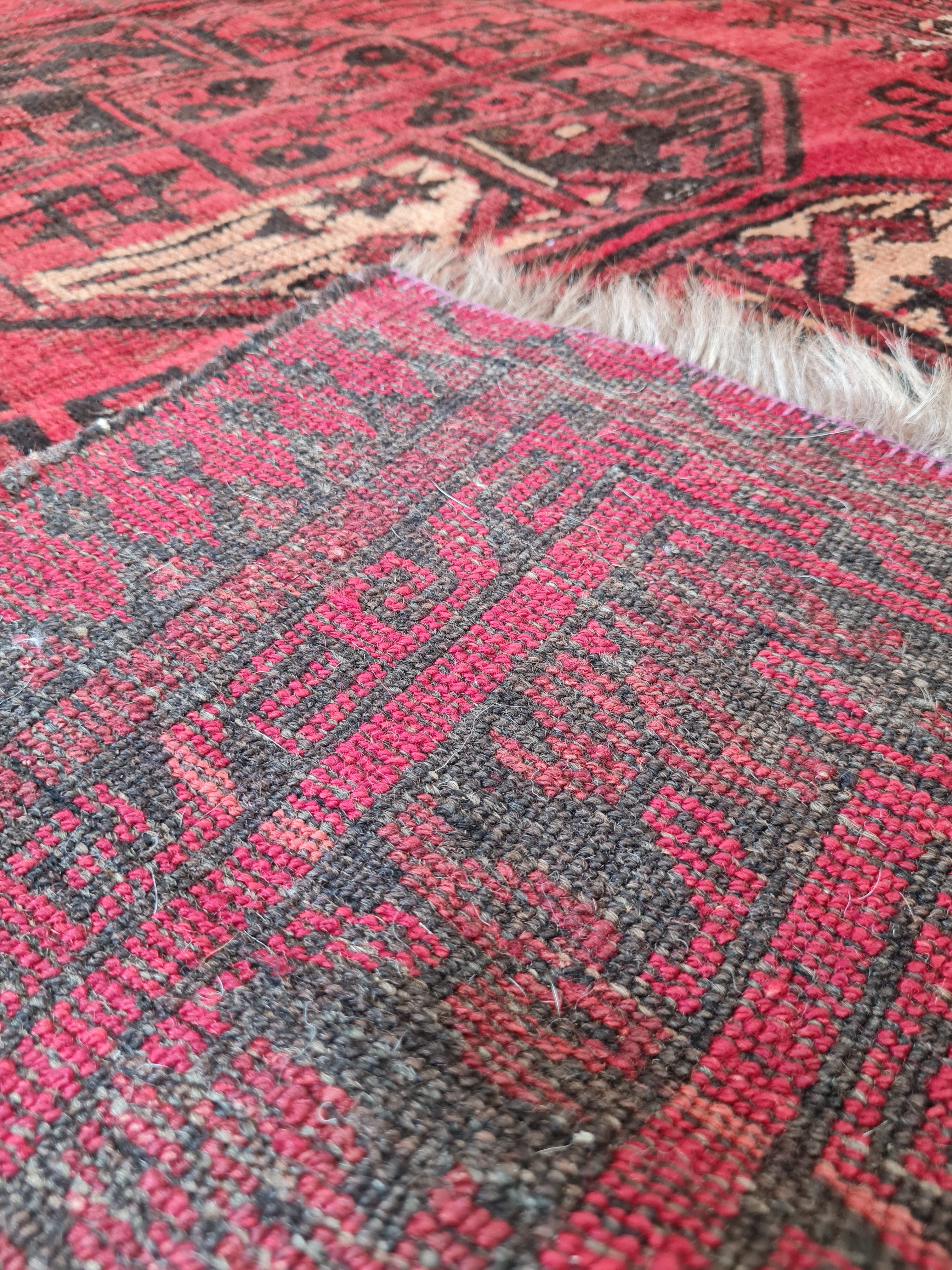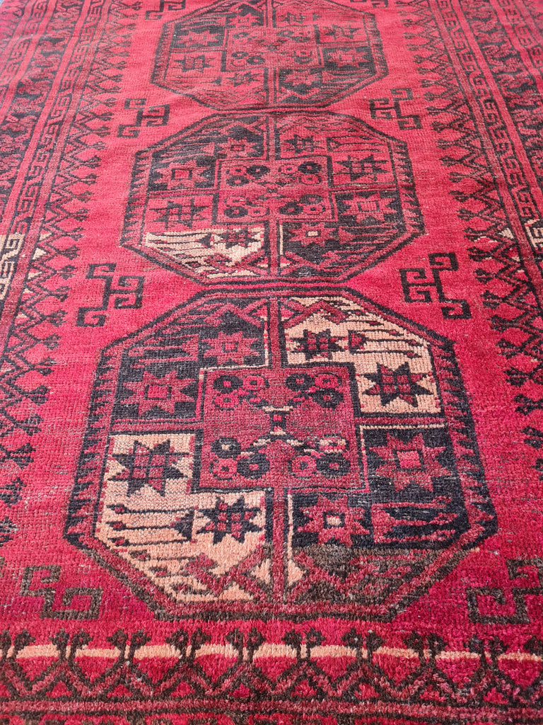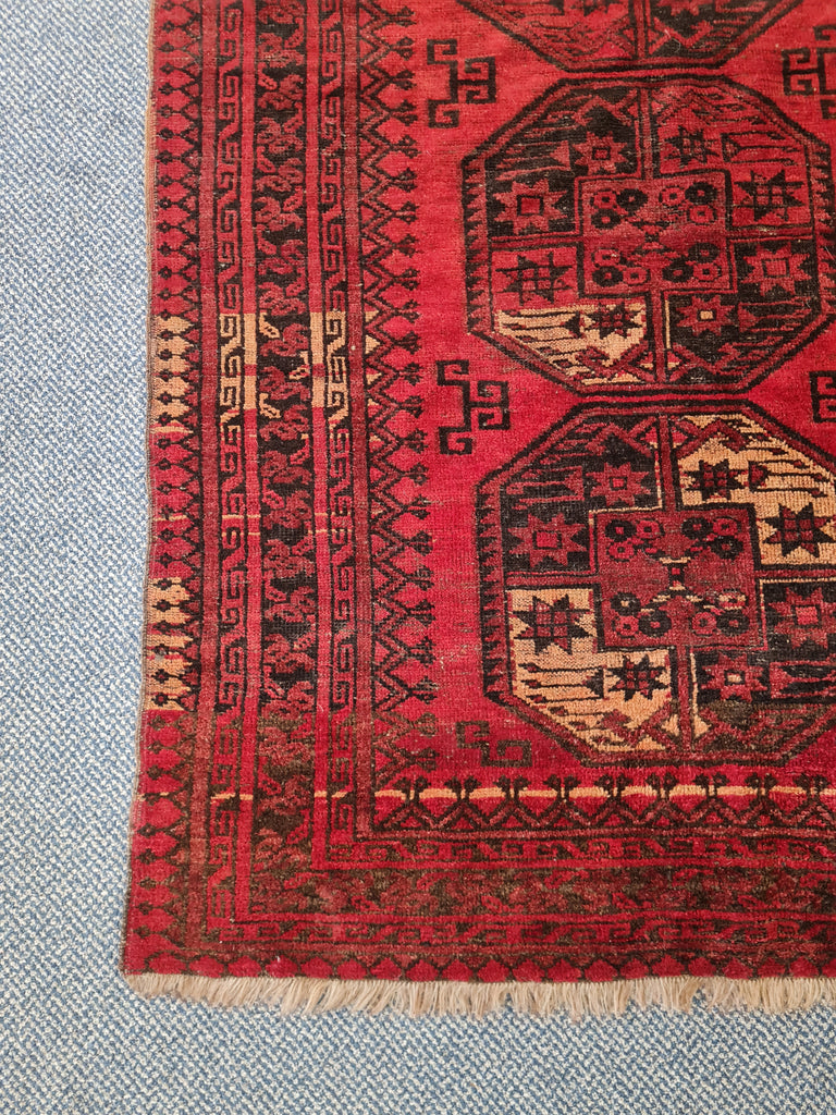 A beautifully hand-knotted Turkmen Bokhara runner, featuring the classic Tekke gul medallions set against a deep red ground, framed by multiple geometric borders. Woven in wool throughout with flat-woven kilim ends intact.