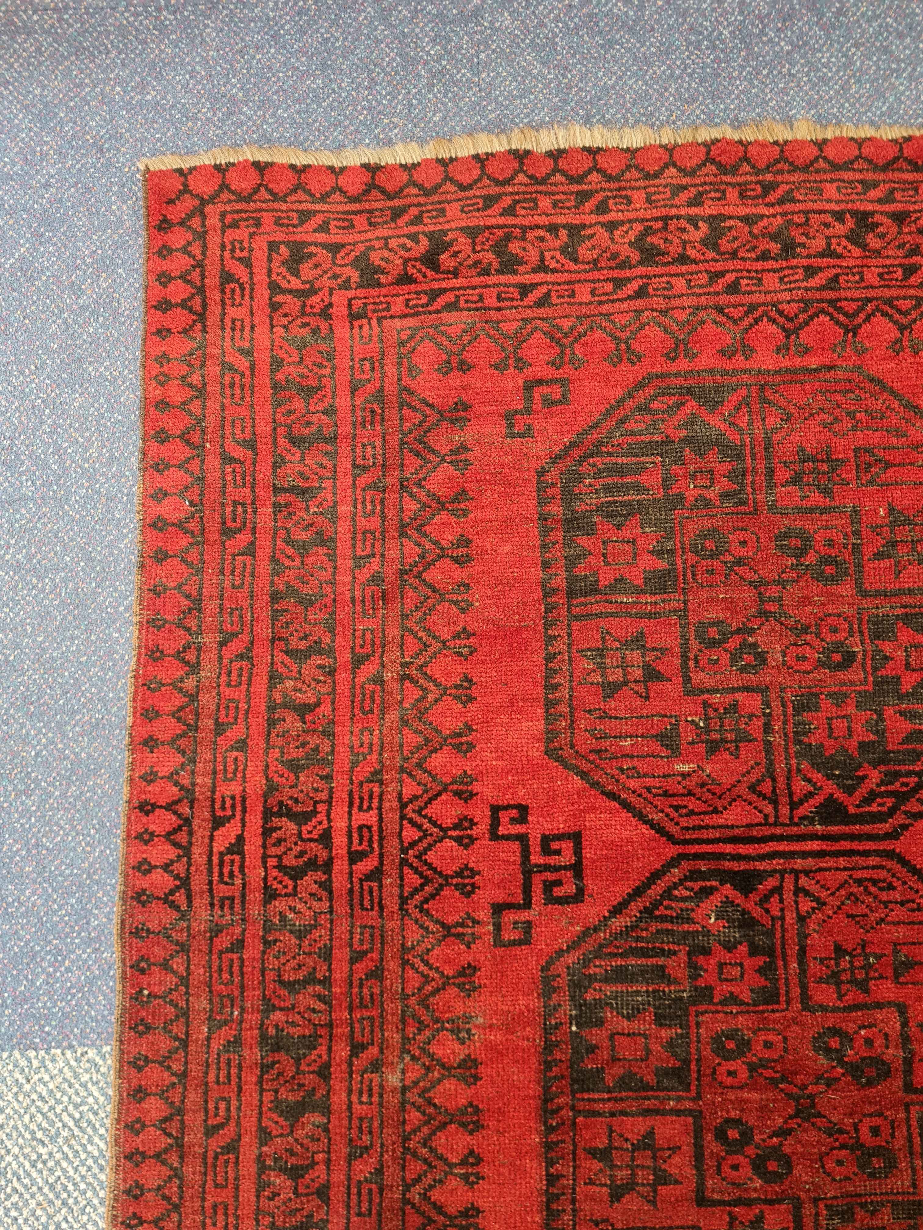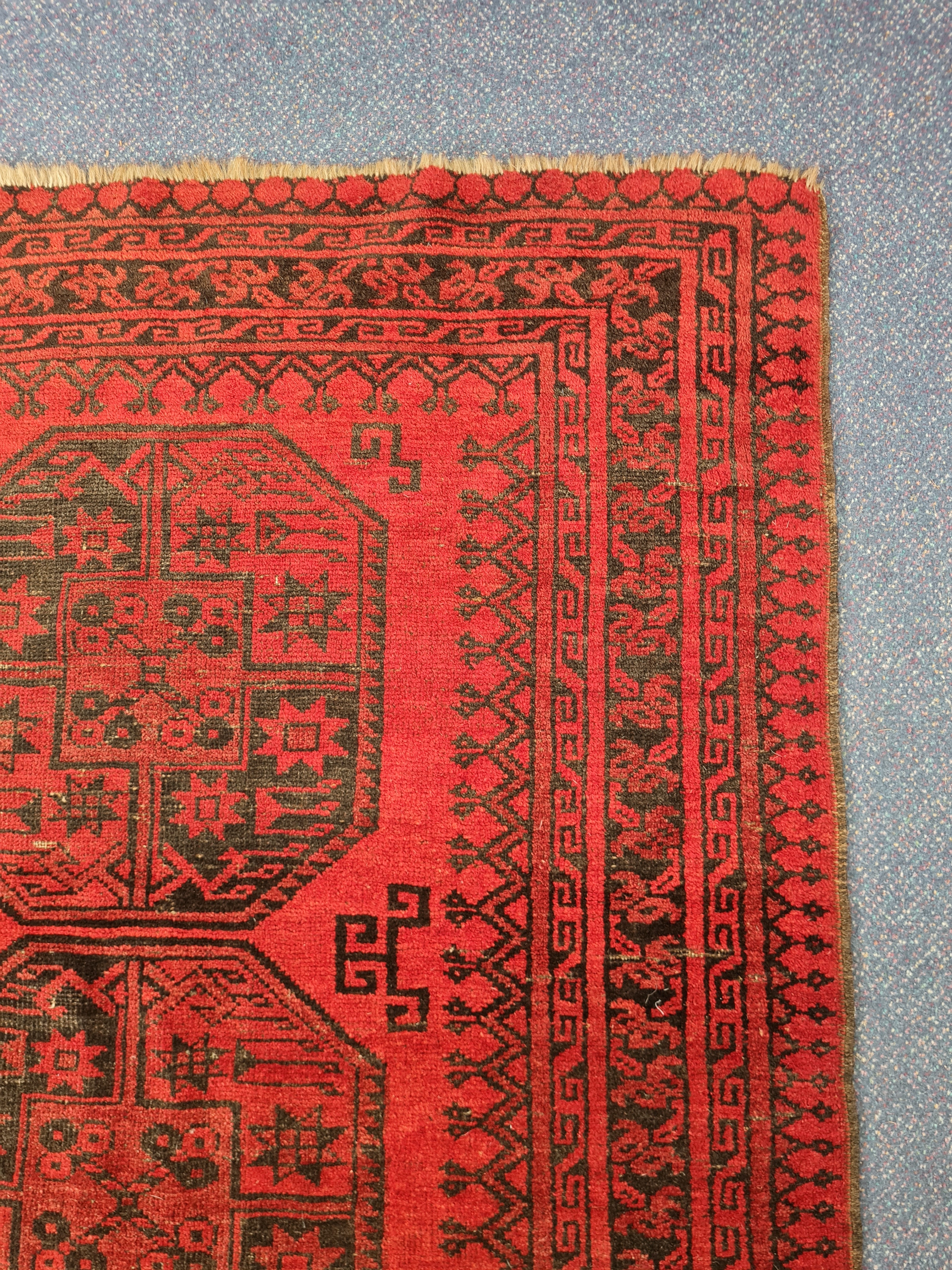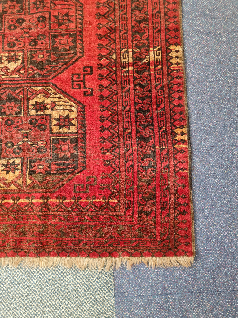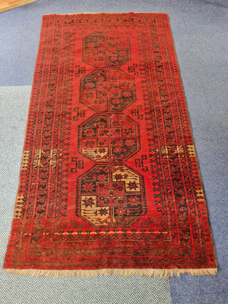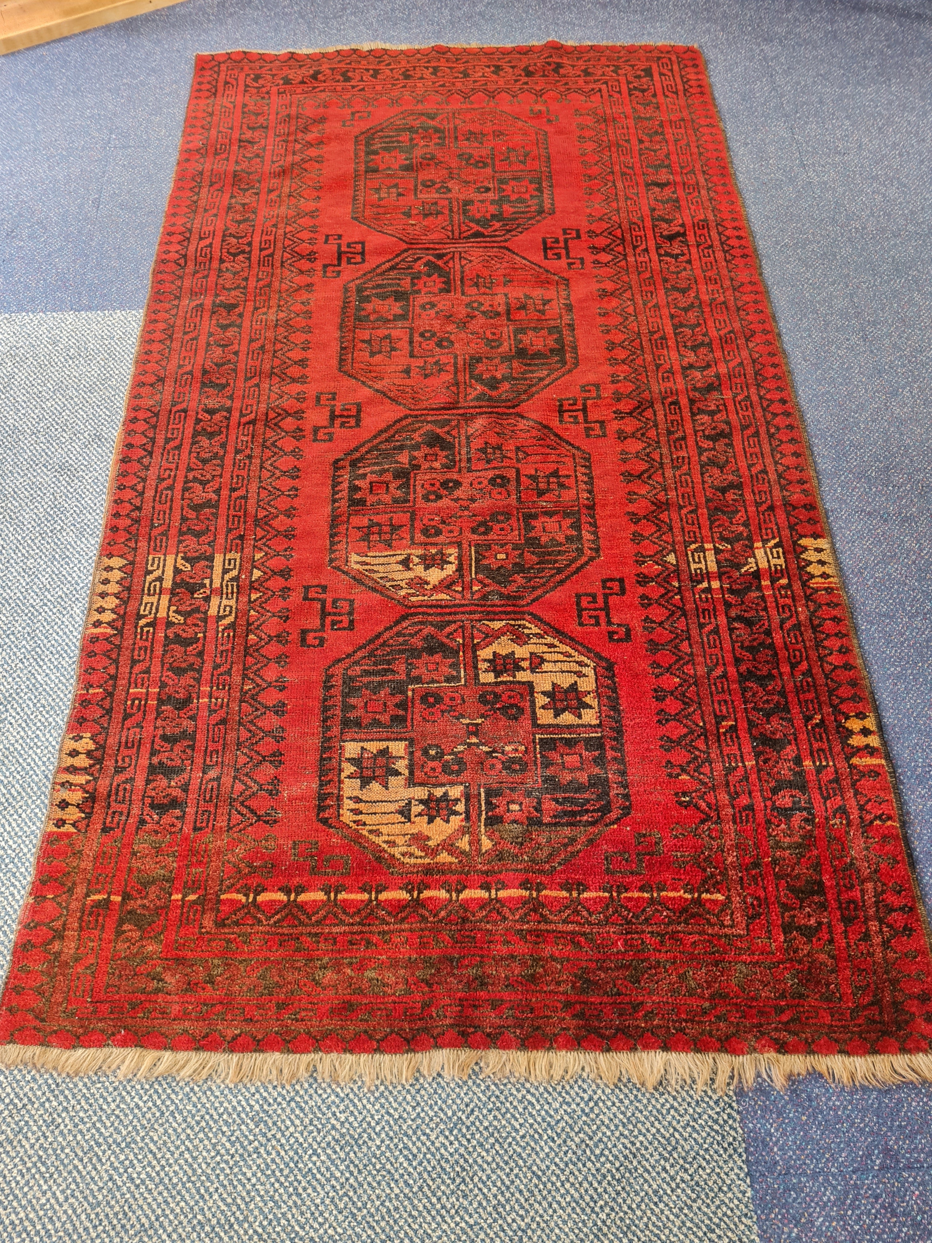 A beautifully hand-knotted Turkmen Bokhara runner, featuring the classic Tekke gul medallions set against a deep red ground, framed by multiple geometric borders. Woven in wool throughout with flat-woven kilim ends intact.