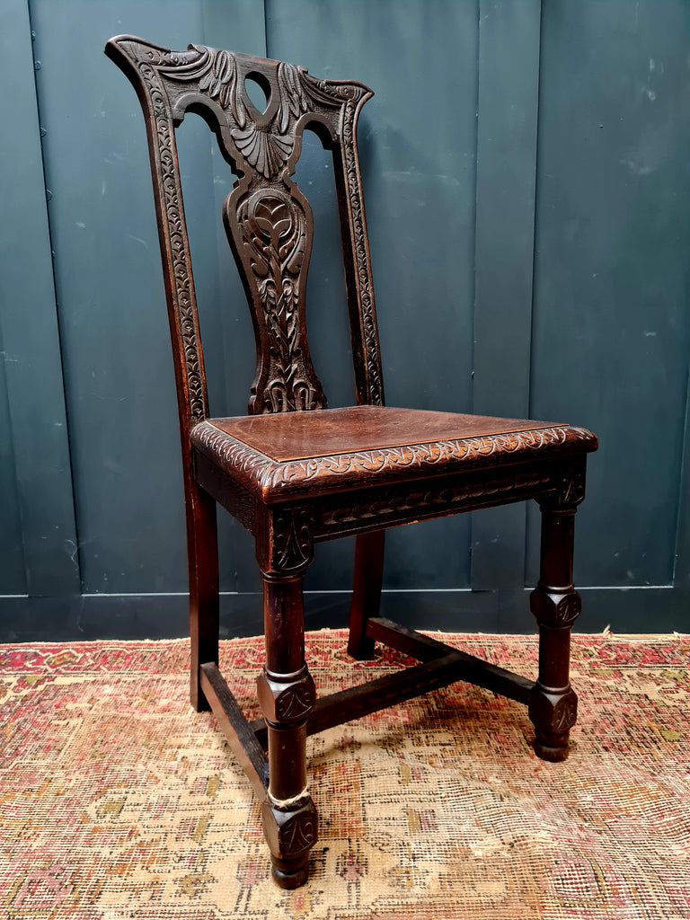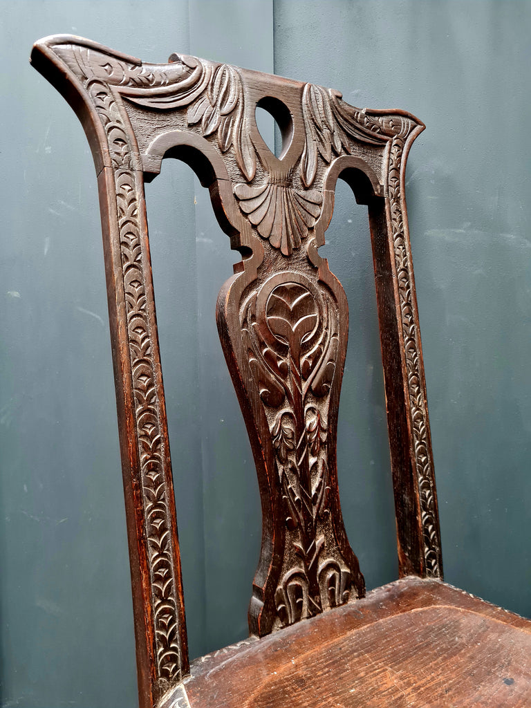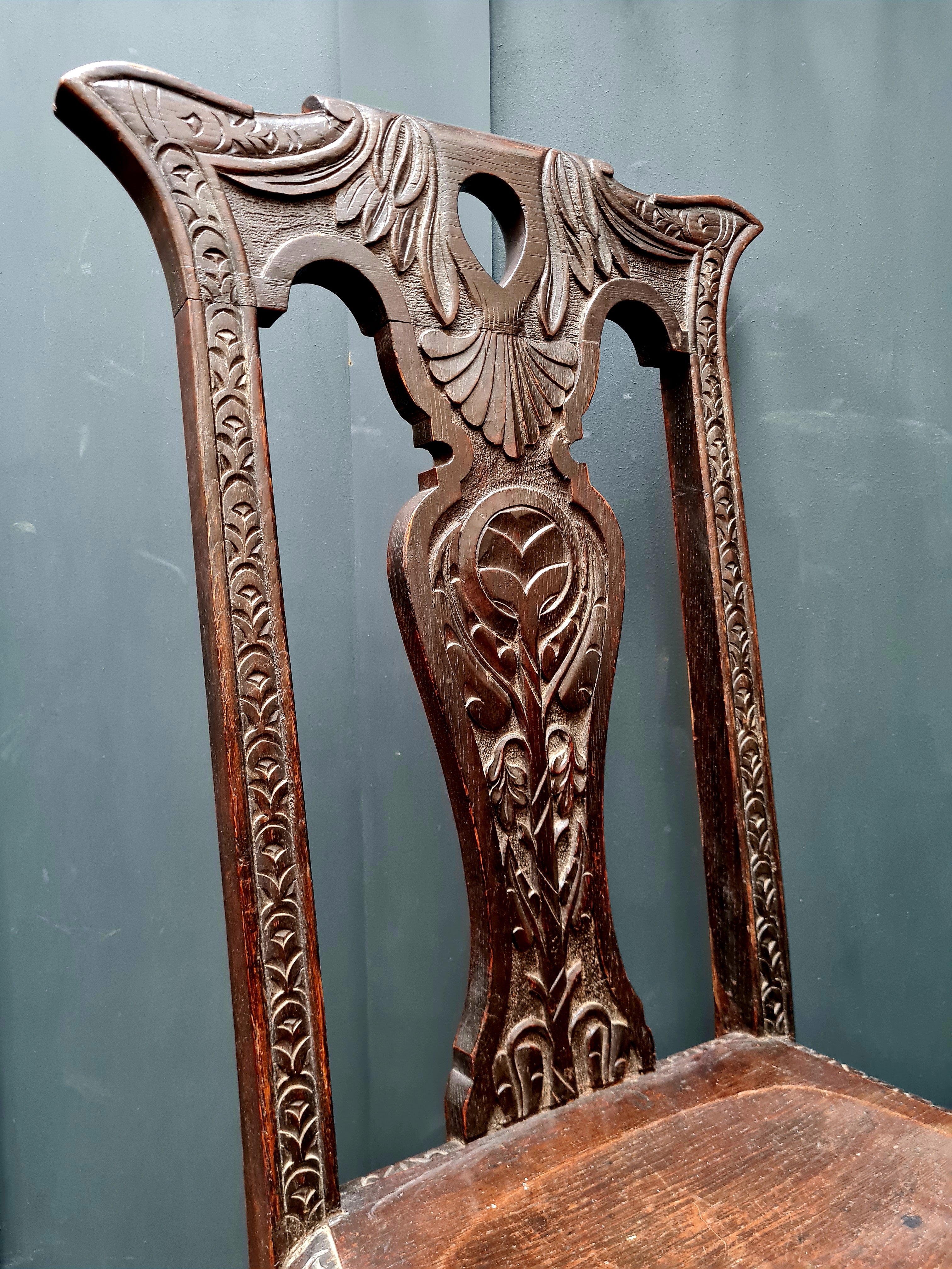 Antique 19th century carved oak chippendale revival style side chair, heavily detailed with shell and foliate carvings throughout. A solid, heavy chair in excellent original condition. Age related wear.