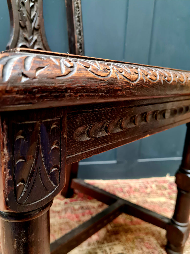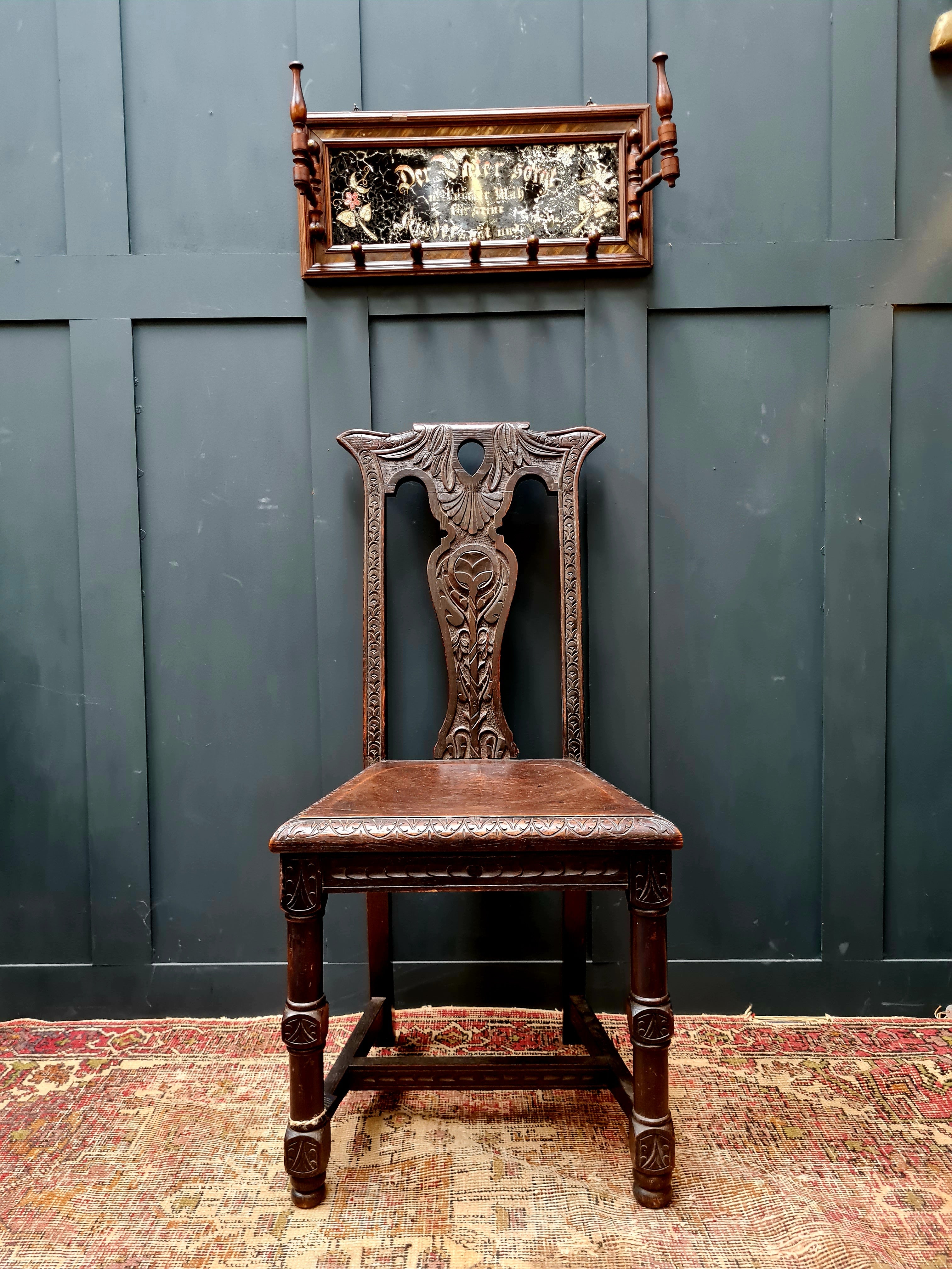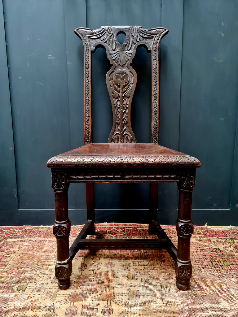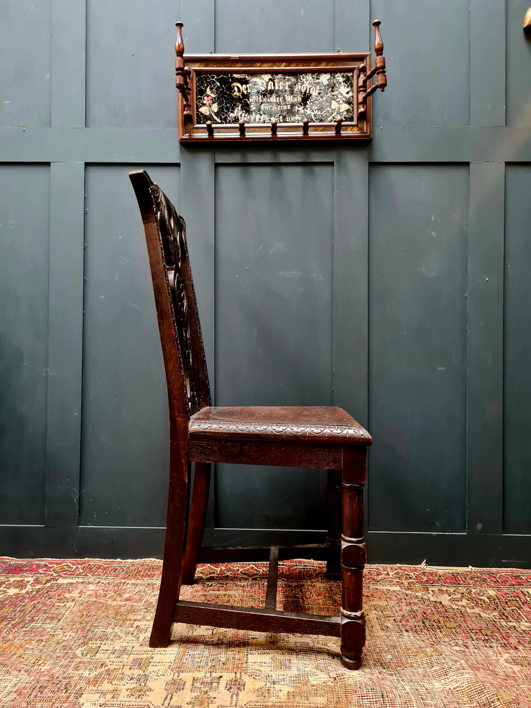 Antique 19th century carved oak chippendale revival style side chair, heavily detailed with shell and foliate carvings throughout. A solid, heavy chair in excellent original condition. Age related wear.