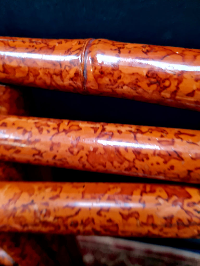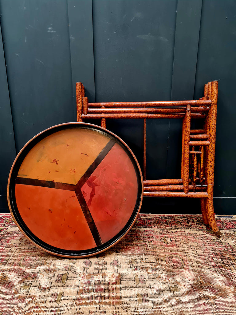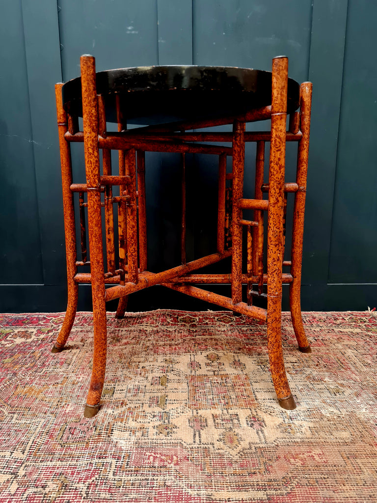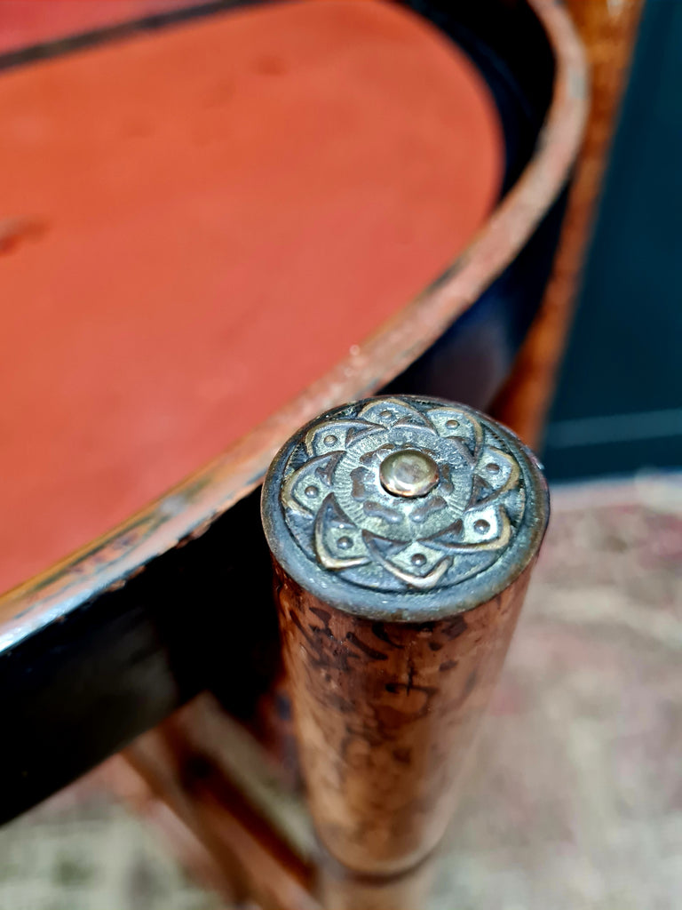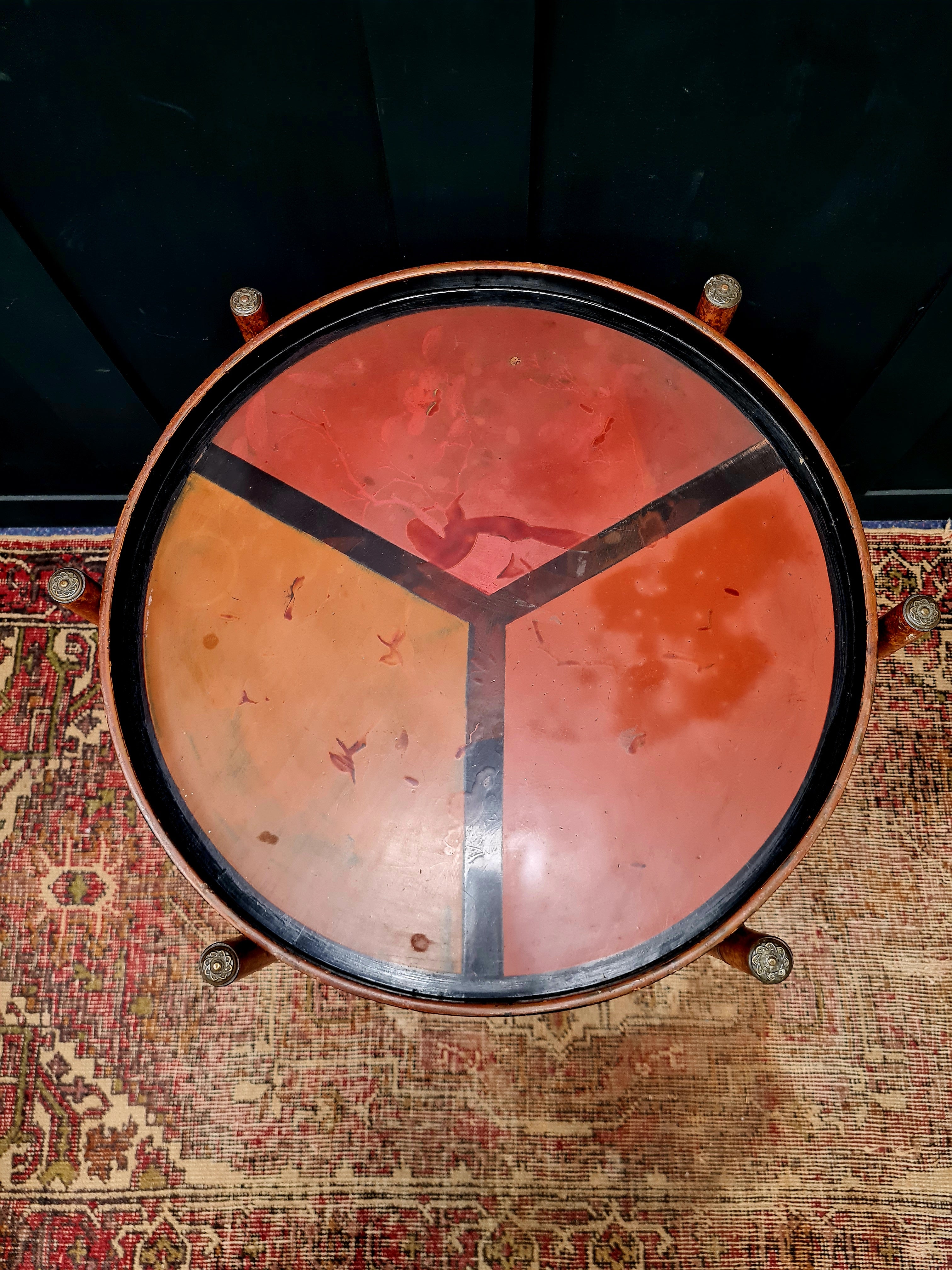 A beautifully decorative late early 20th century Anglo-Japanese side table, c1900-1910. Finely painted bamboo frame and a hand-painted lacquered papier-mâché top in warm orange and red tones, divided by bold geometric lines. Finished with ornate brass floral caps to each leg — a hallmark of fine English Aesthetic Movement design.