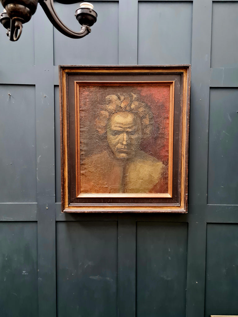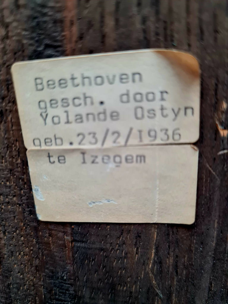 Antique Flemish Framed Oil Painting on Canvas, Portrait of Ludwig Van Beethoven, marked Yolande Ostyn, 1936 Izegem(West Flanders, North Belgium).