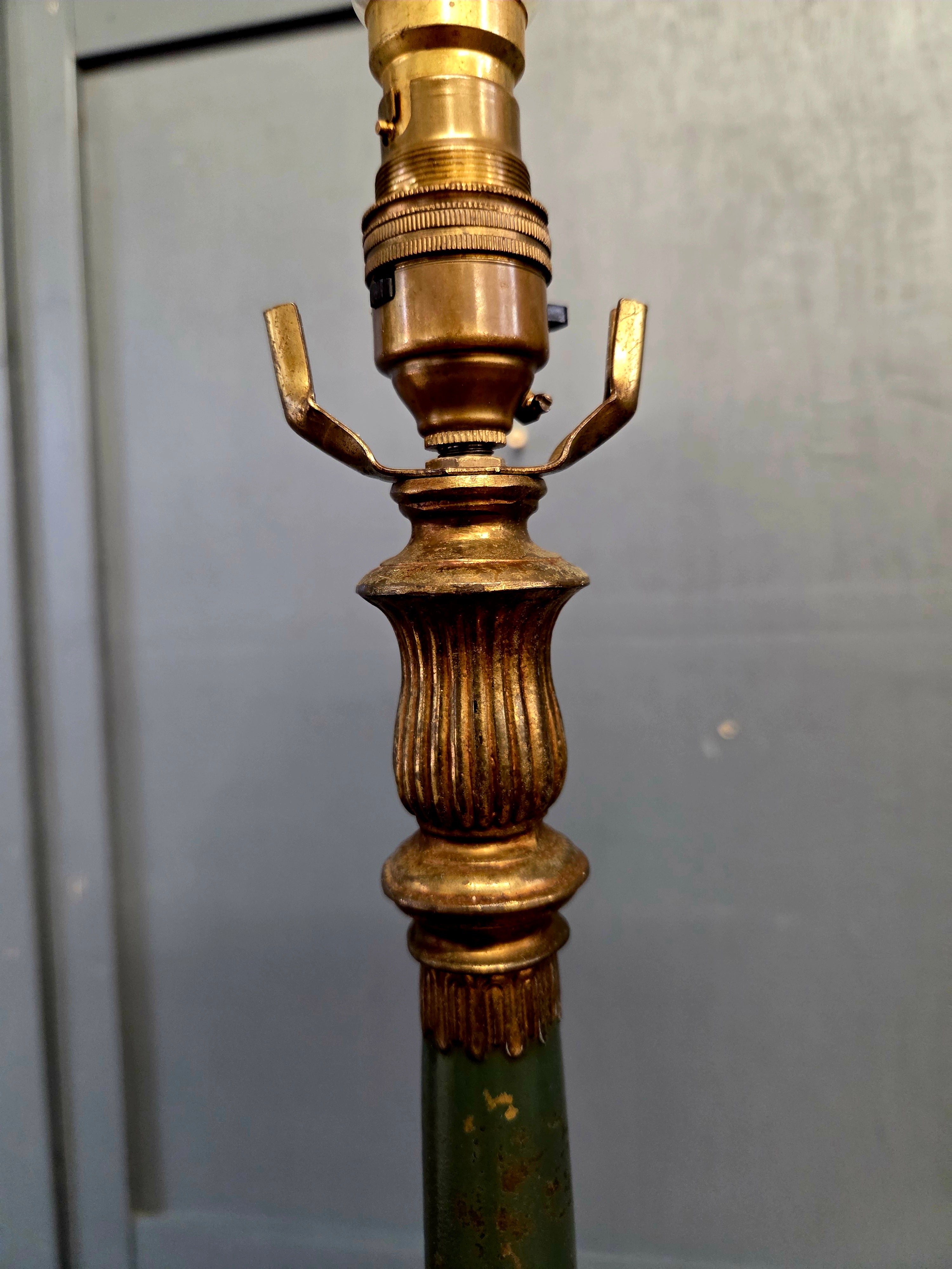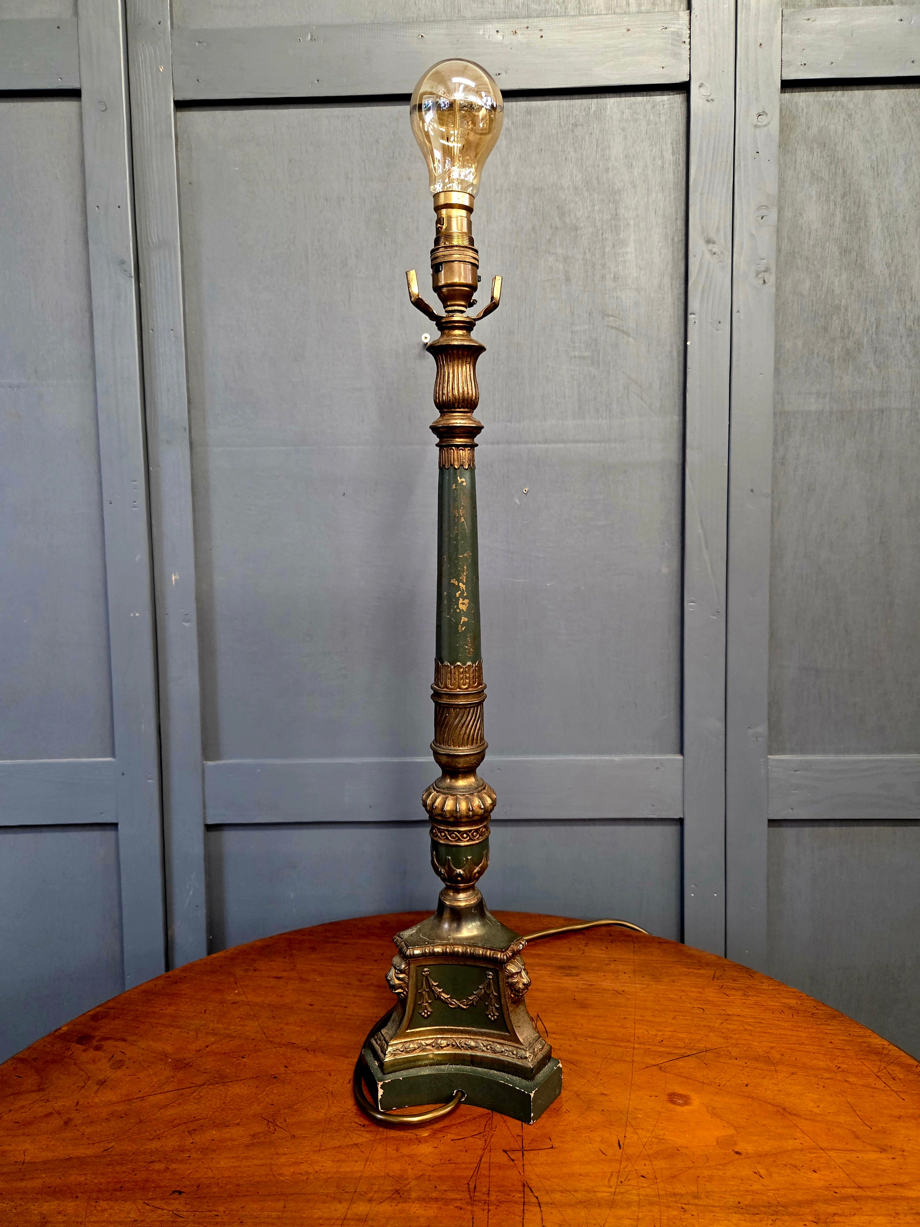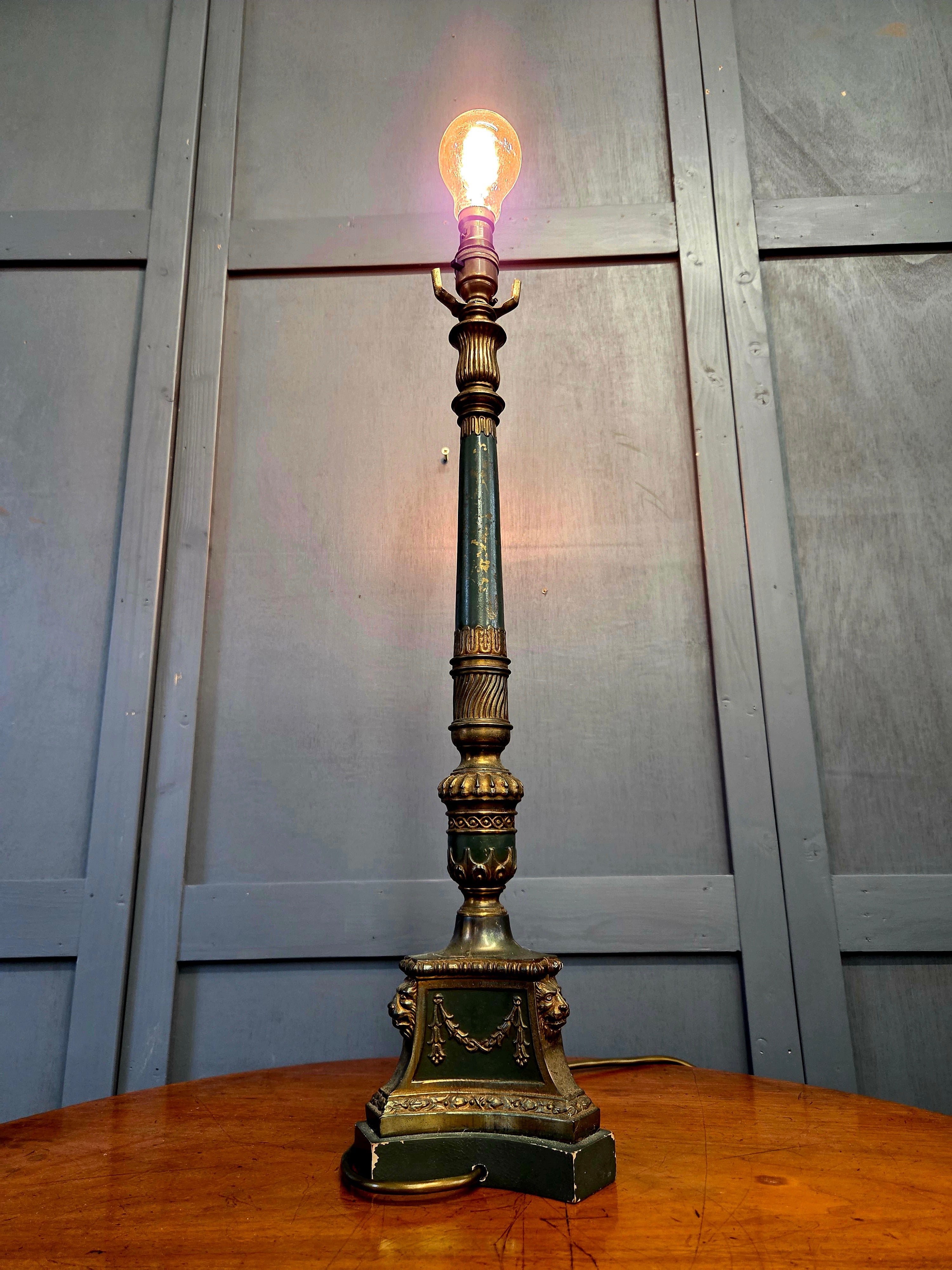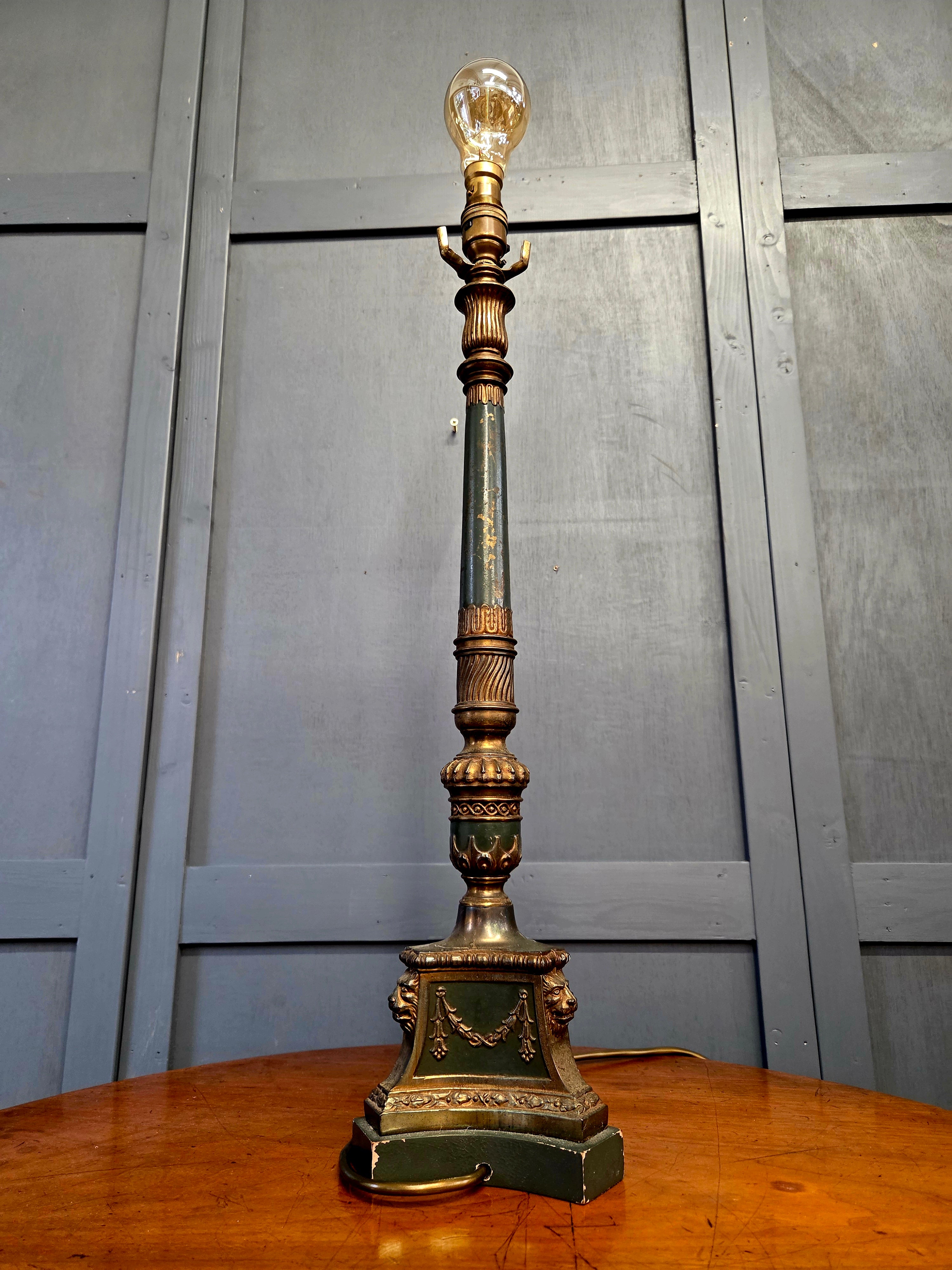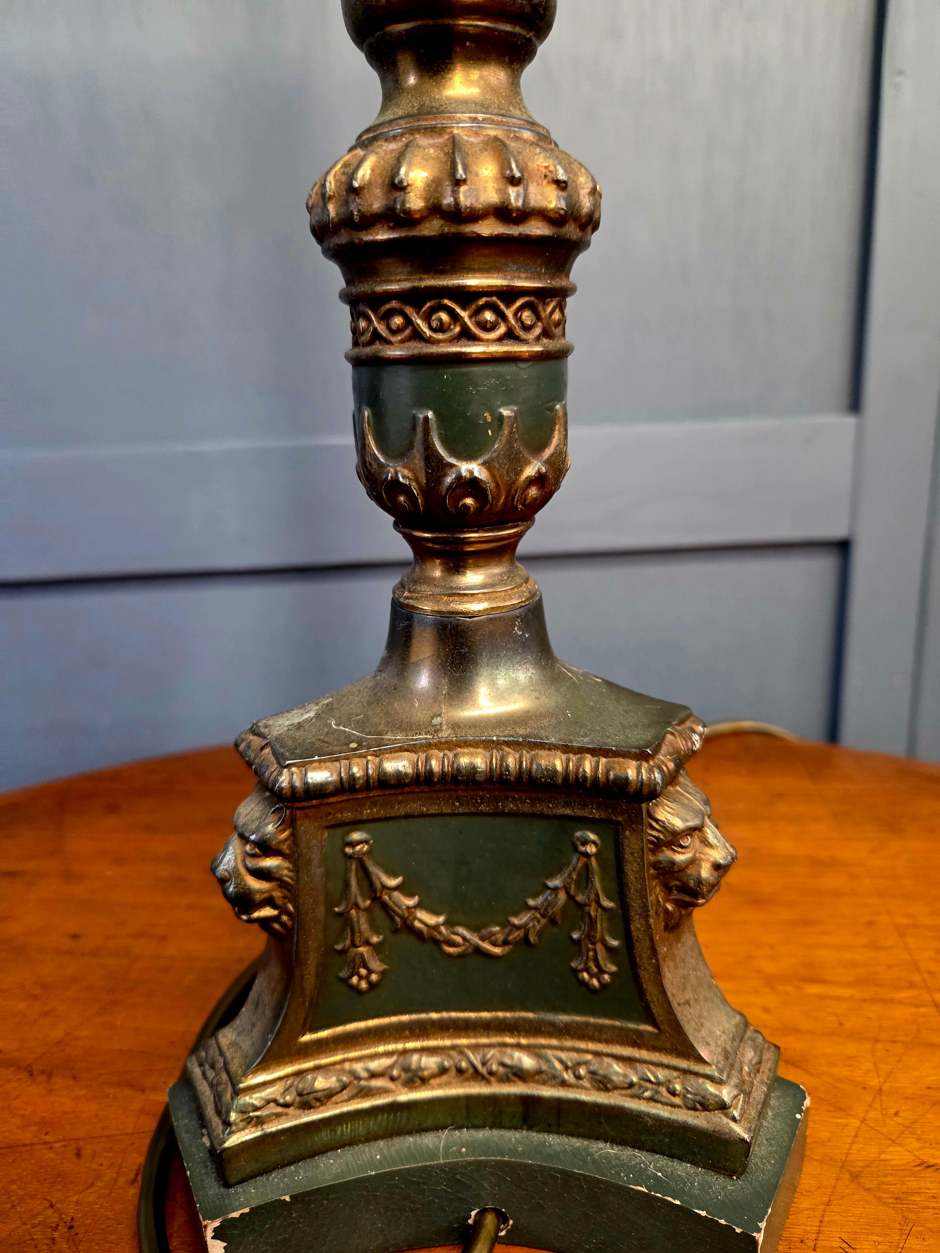 Solid brass lamp with fluted column, classical swags and lion mask decoration to the base. Finished in a rich verdigris green with gilt highlights, intended to evoke aged bronze. Retains original shade support arms flanking the lampholder, suitable for a gallery or fabric shade if desired.