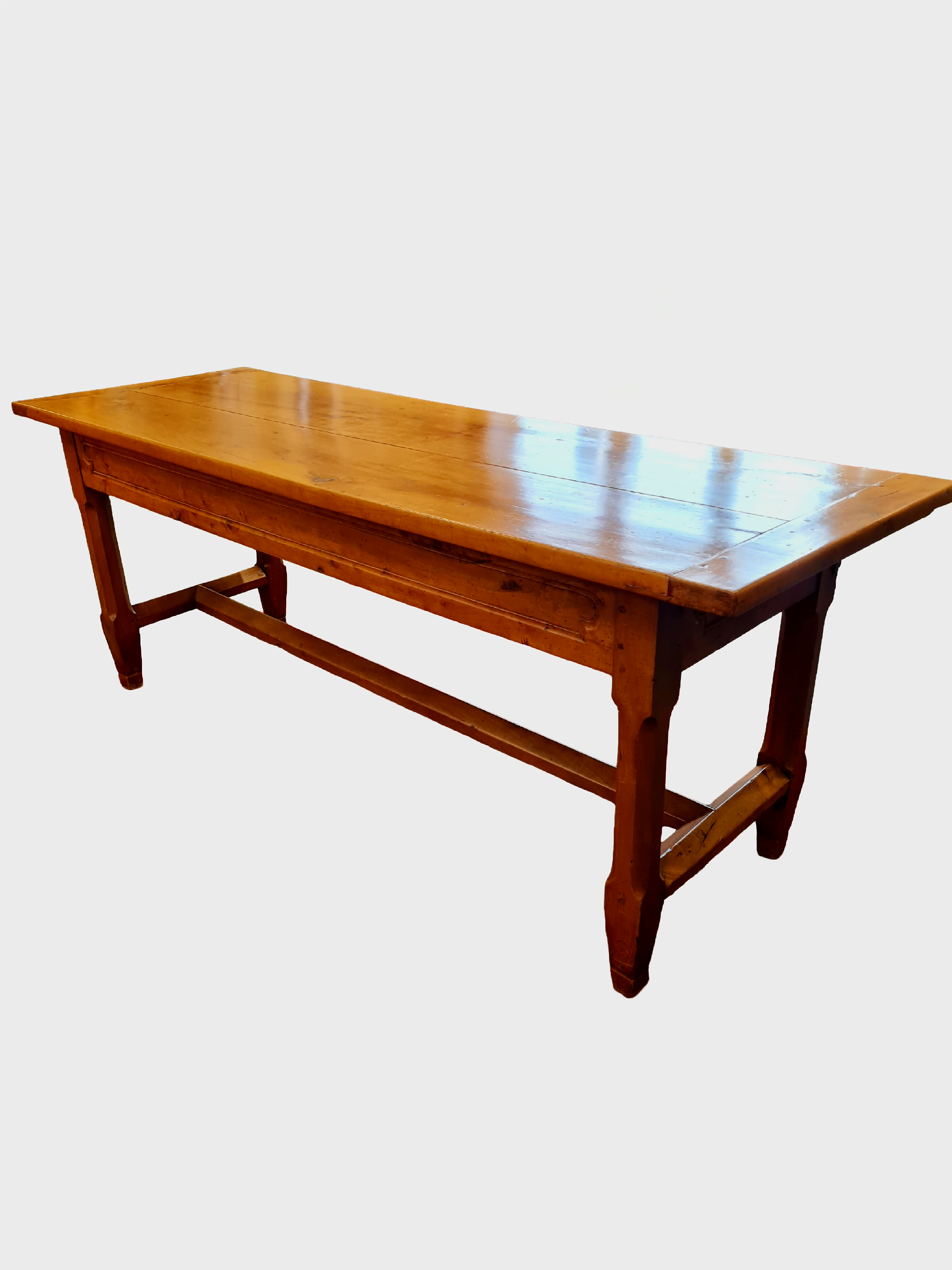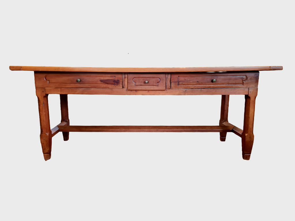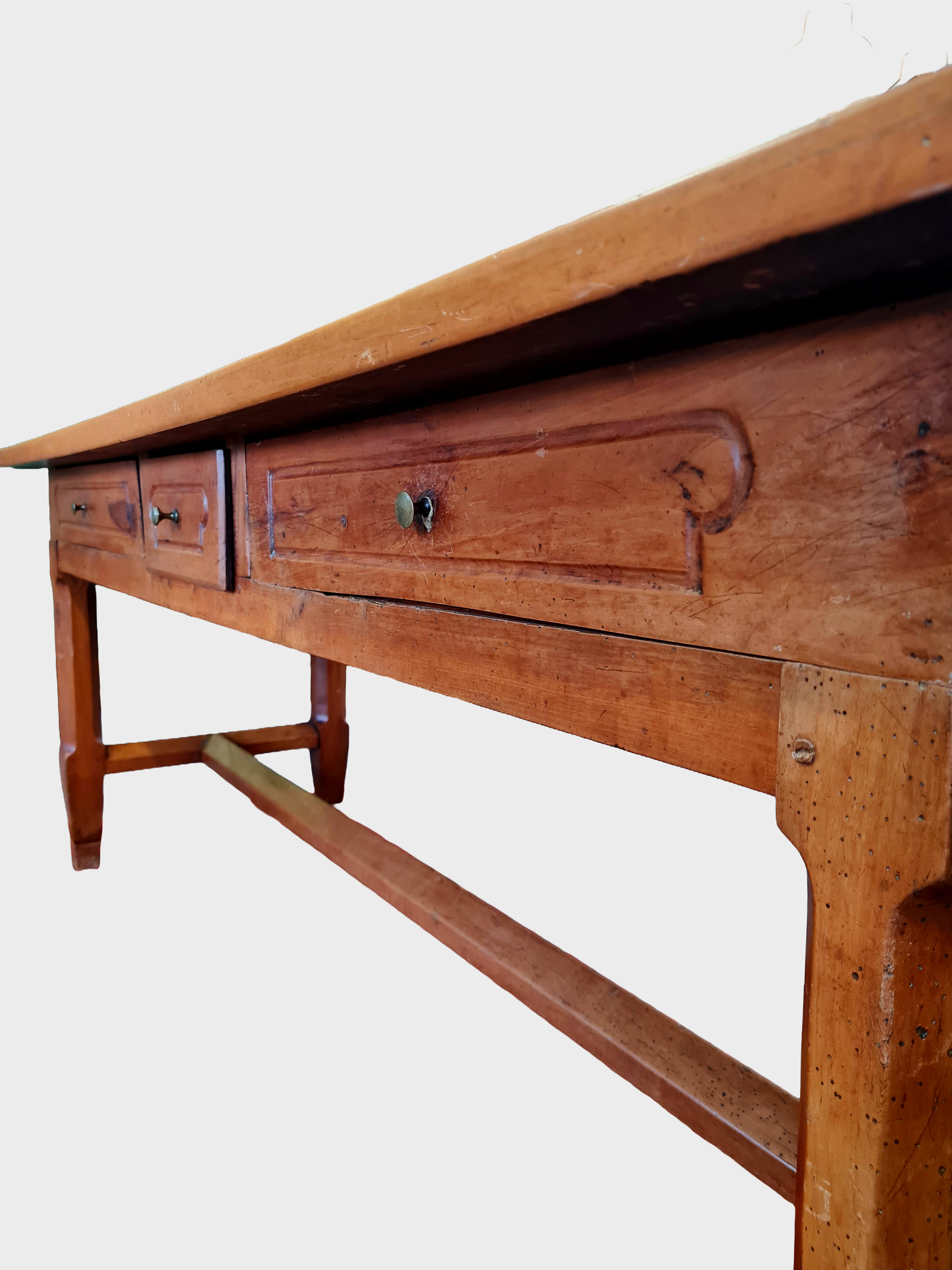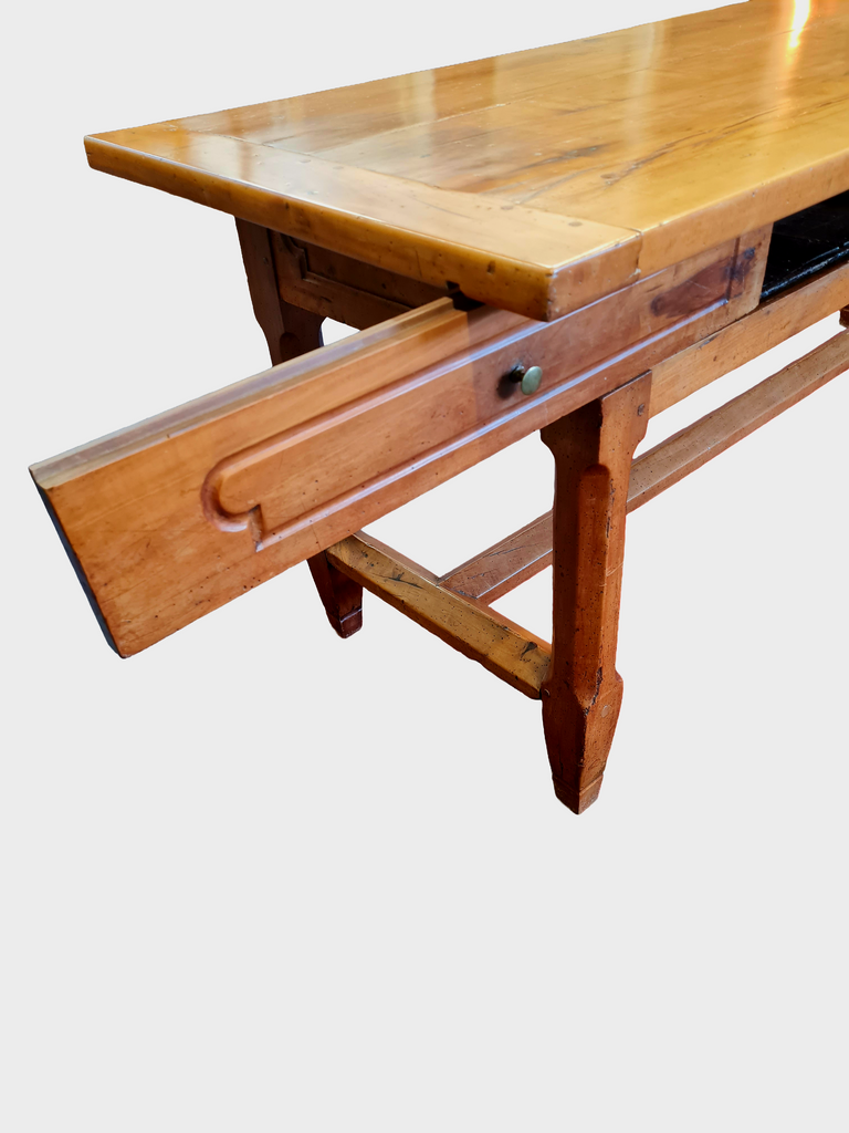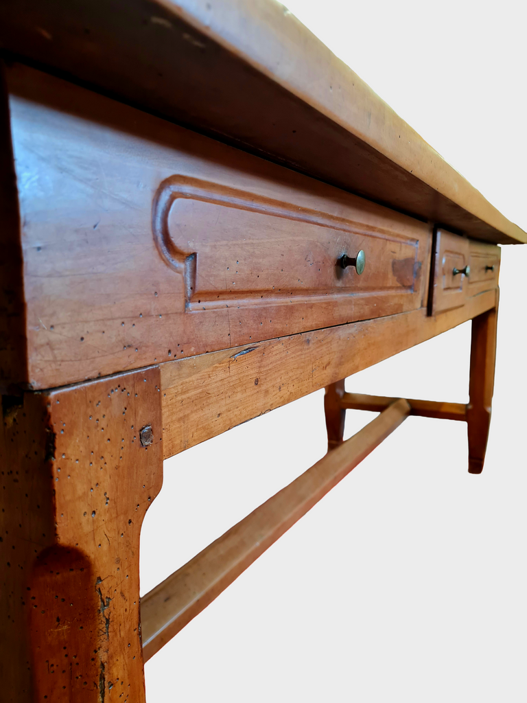 Large antique French elm and fruitwood farmhouse refectory style table (c.1920) with a warm, honest patina and classic pegged stretcher base. Features its original centre drawer, plus two wider sliding drawer fronts that open to reveal deep internal storage spaces within the frame. Historic worm treated and wax-filled; solid and ready to use. A striking 210cm provincial table with great character and practical storage.