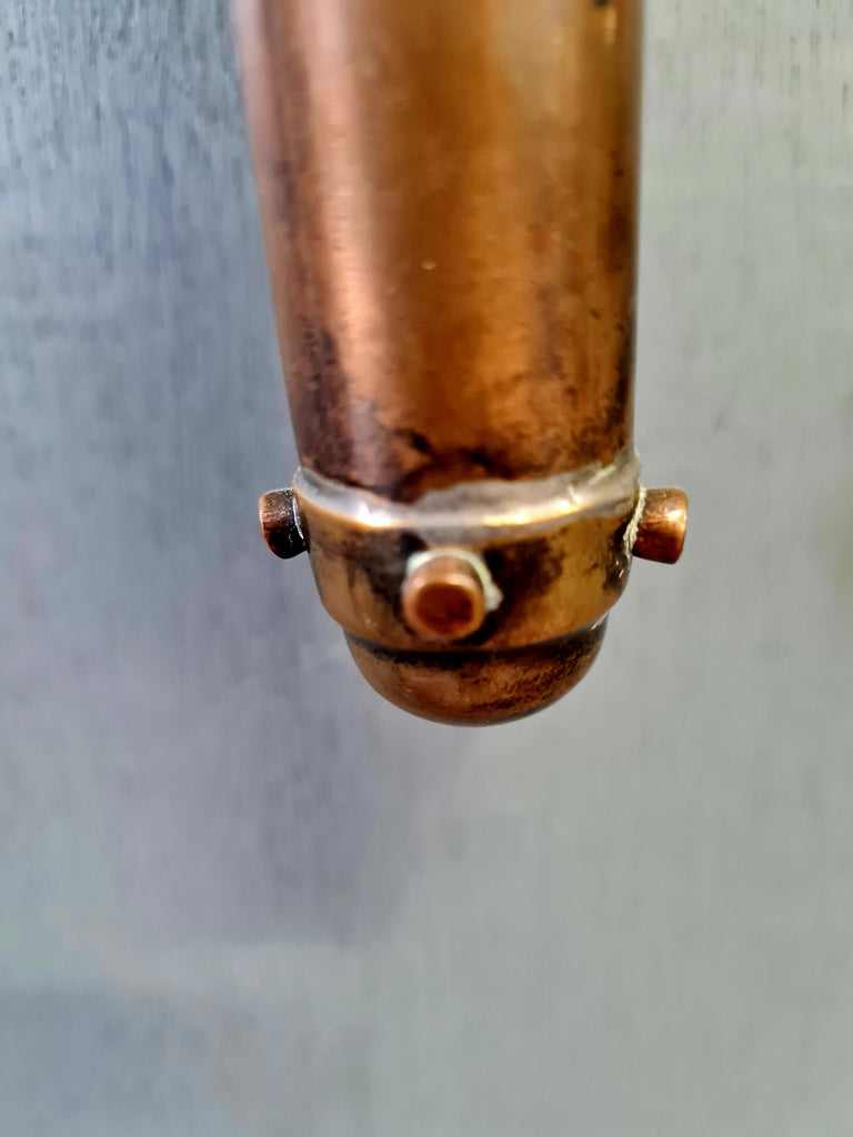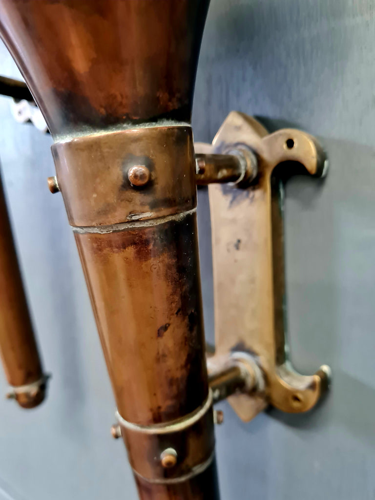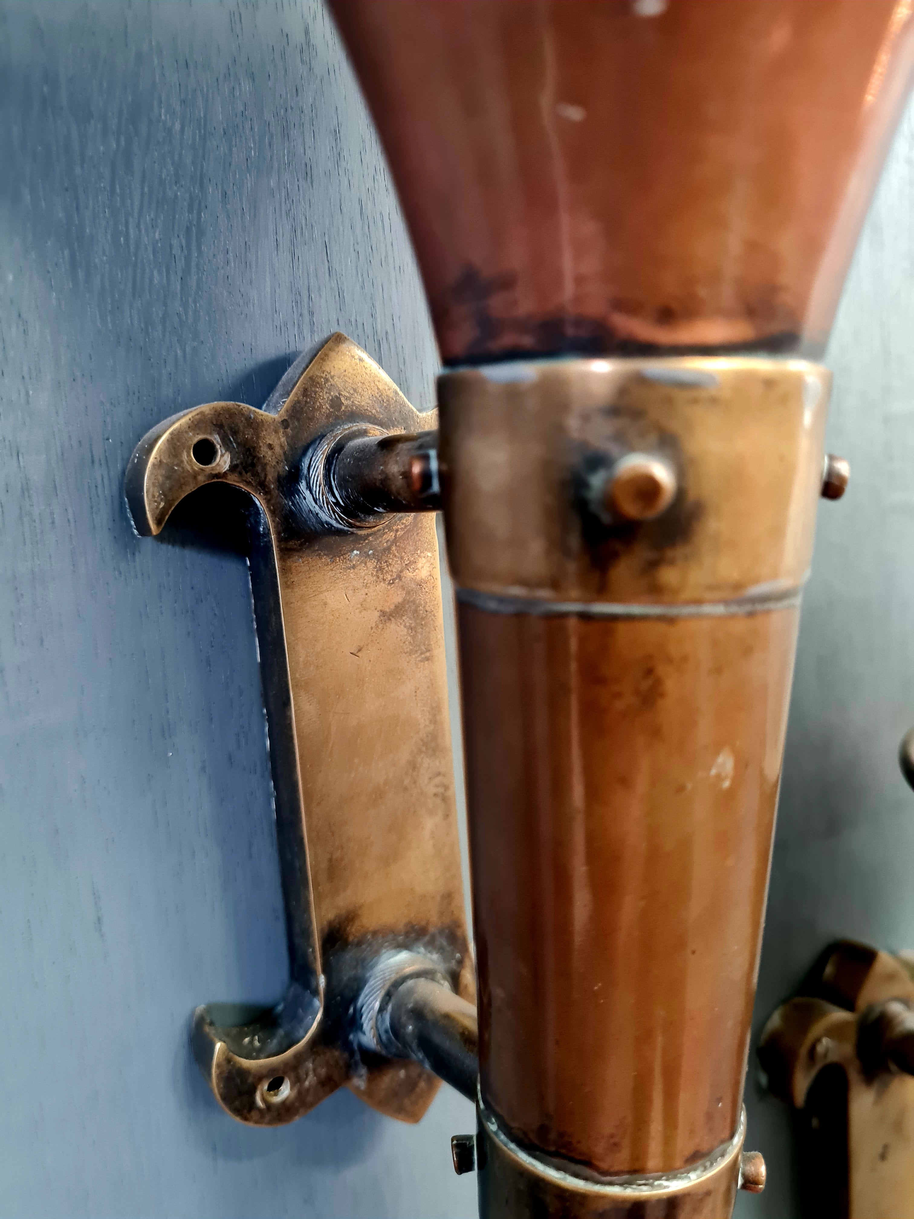 A striking pair of early 20th-century torch-form wall sconces, crafted in warm aged copper with riveted bands and shaped wall brackets. The design sits comfortably between the late Arts & Crafts movement and early Art Deco, combining honest hand-worked metal with a bold, architectural silhouette.