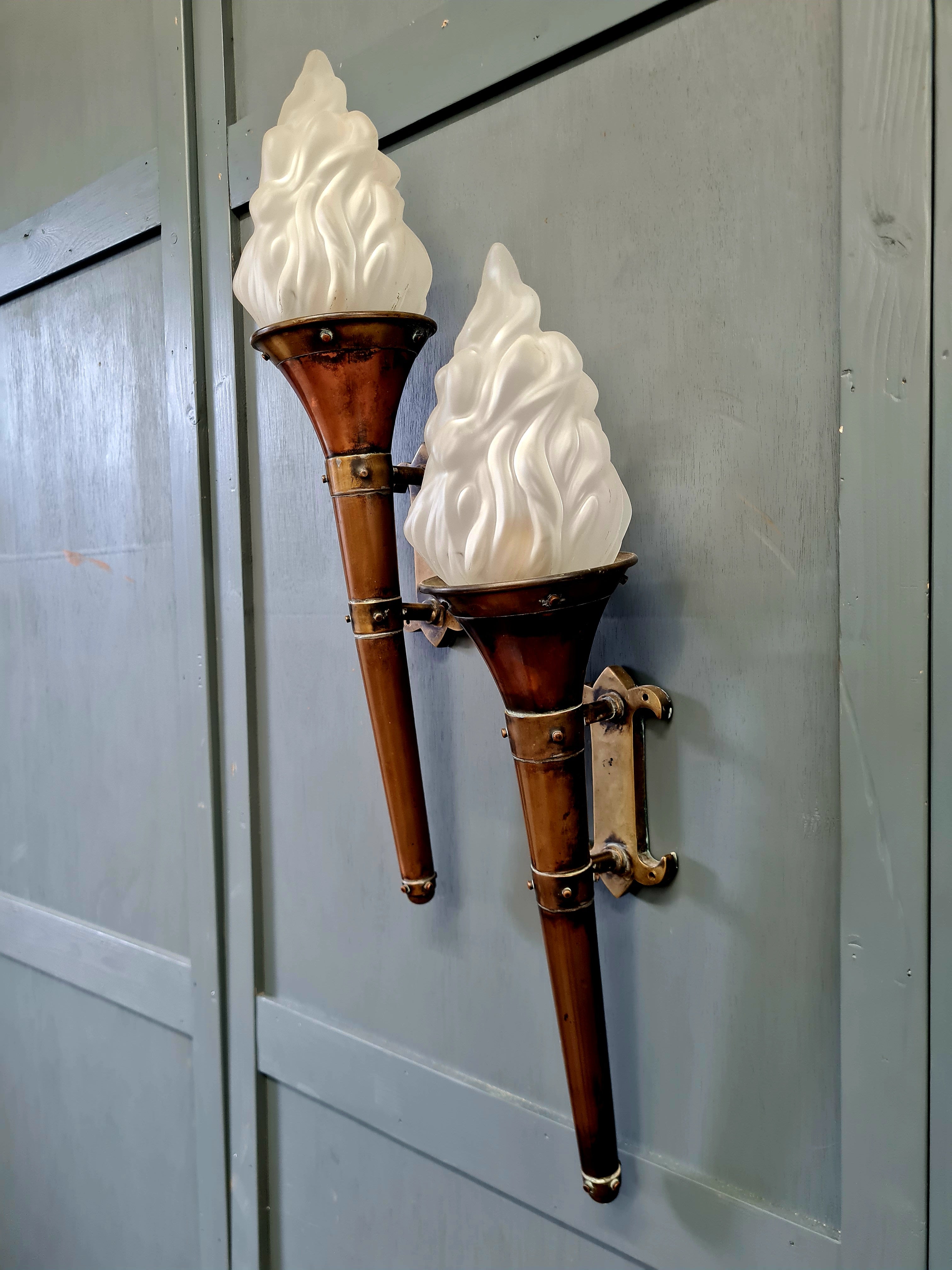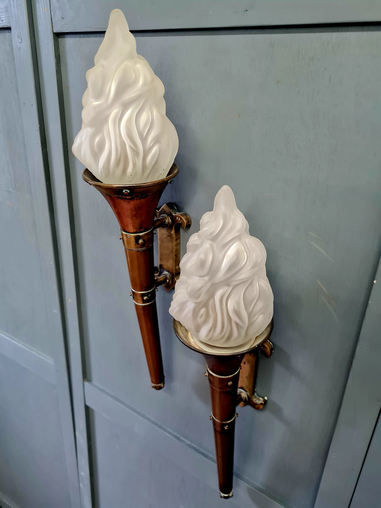 Each sconce is topped with its original opalescent glass flame shade, beautifully modelled with swirling relief that glows softly when lit. The copper bodies have developed a rich natural patina, giving them real presence on the wall.