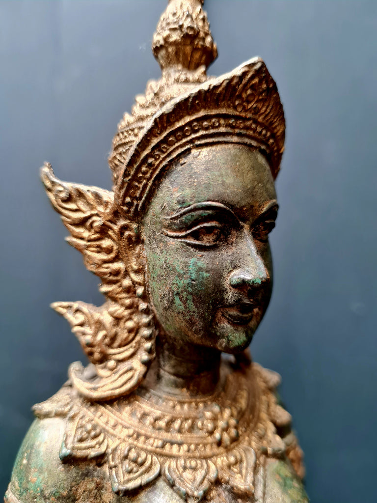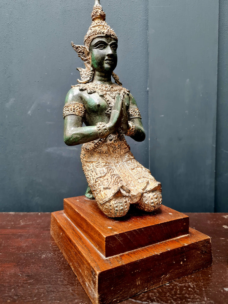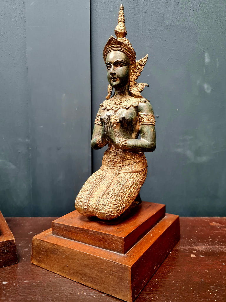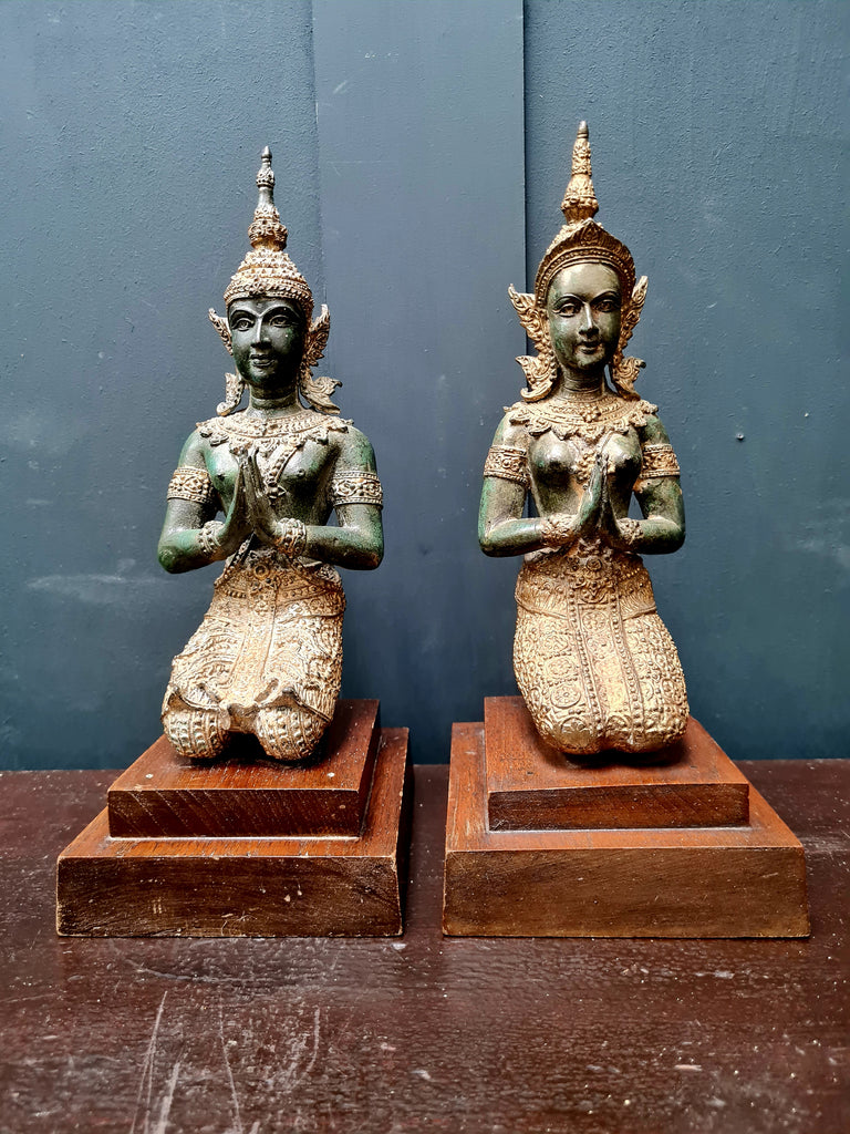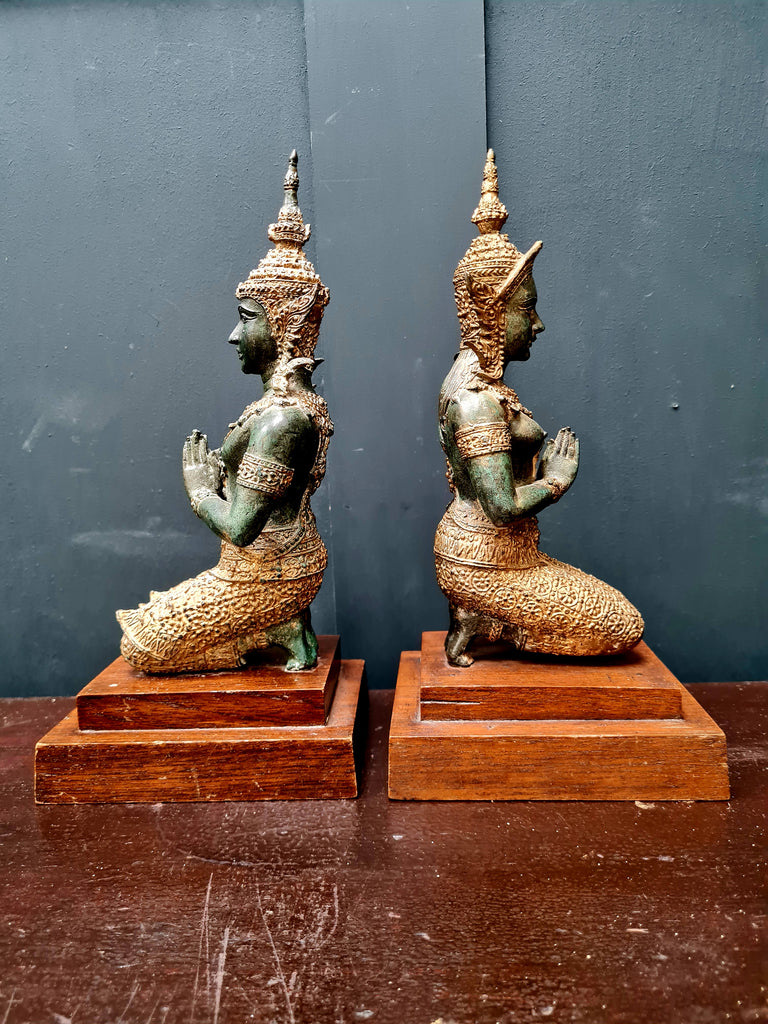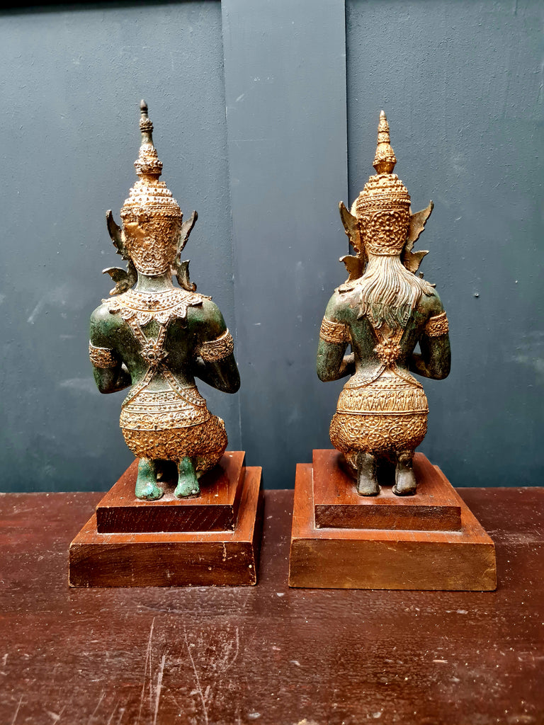 Pair of Early 20th Century Solid Bronze Thai Temple Guardians - Thepphanom, male and female with gilt detailing on solid wood plinths. Age relate wear/patina.