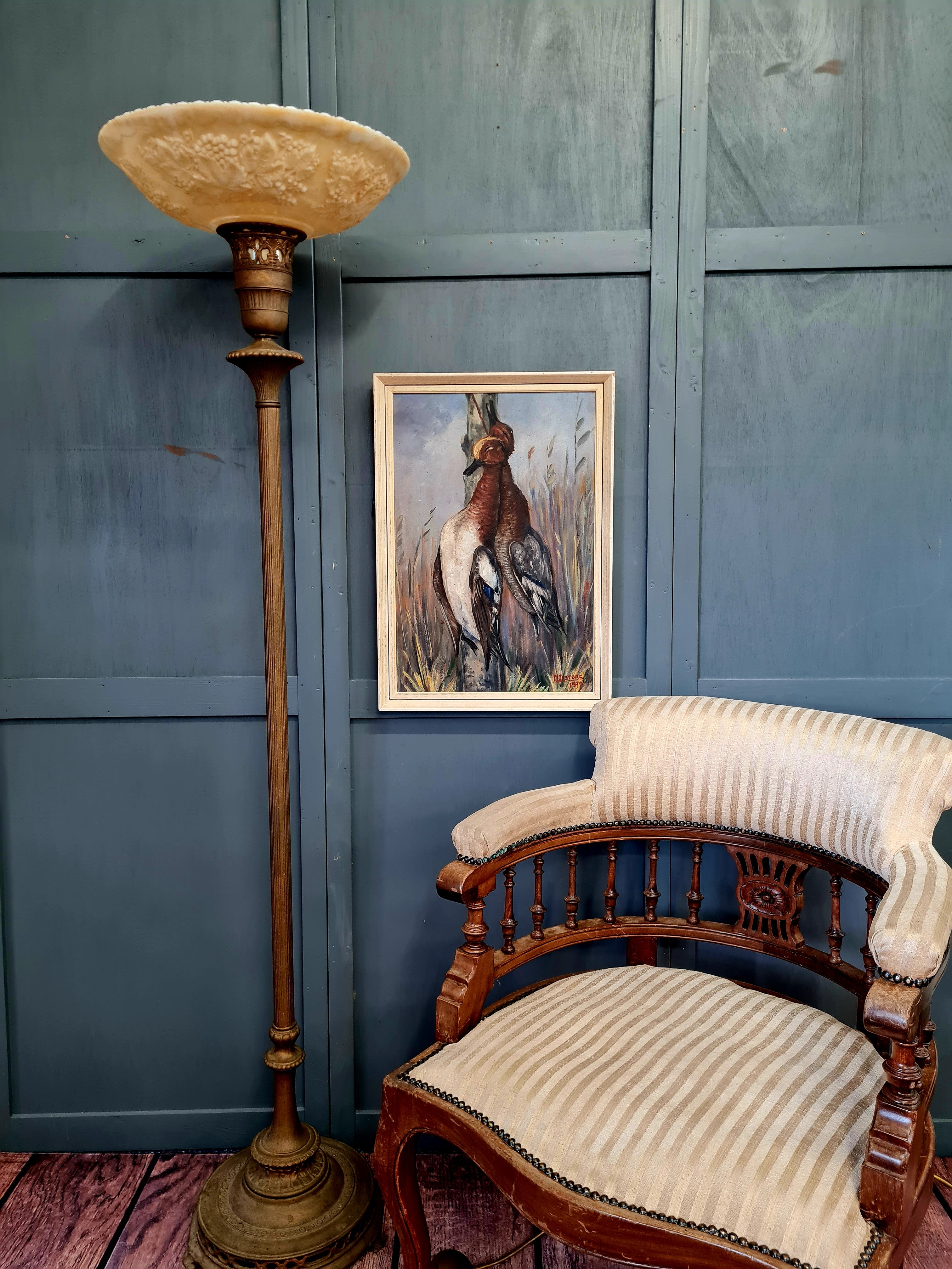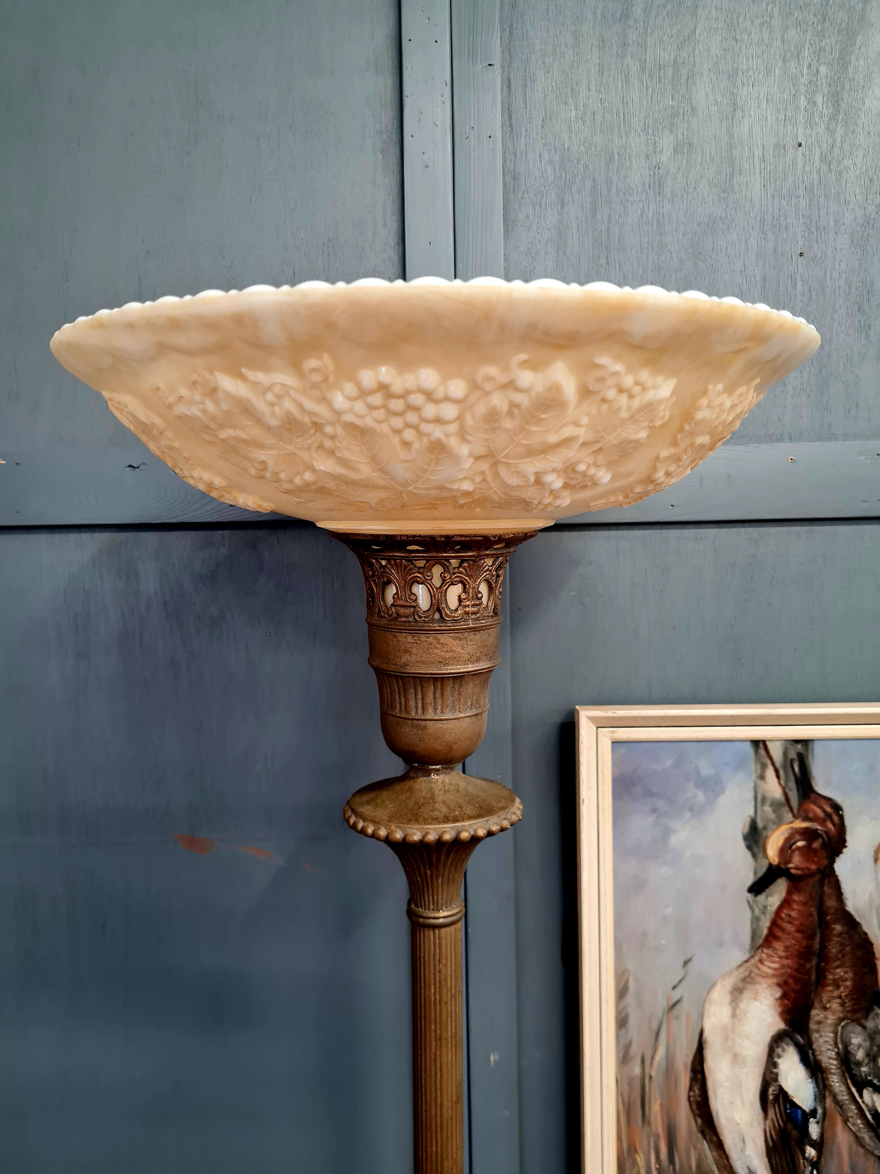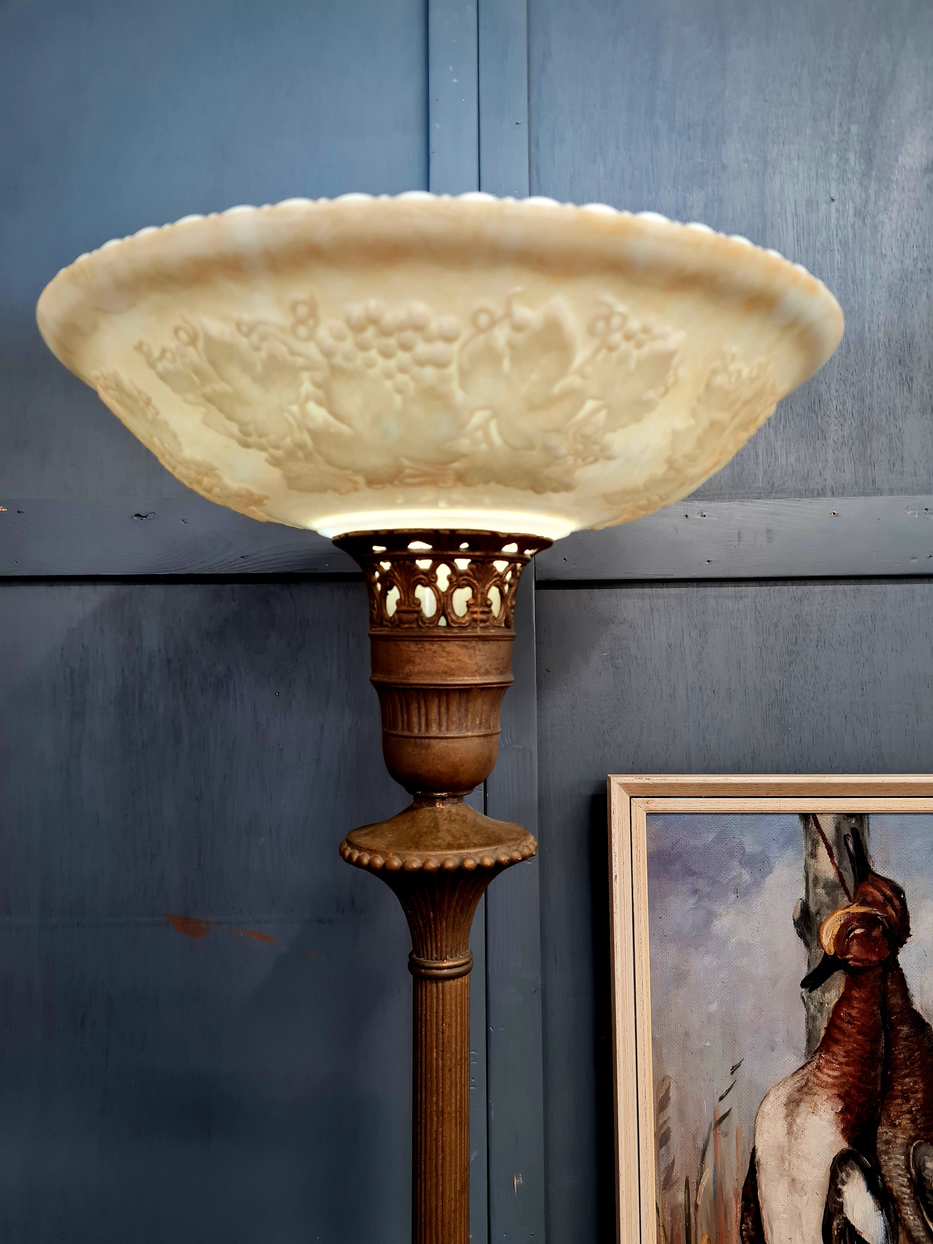 Elegant vintage torchiere floor lamp featuring a beautifully detailed pressed glass shade with raised floral and botanical motifs. The creamy, translucent glass creates a soft upward glow and is characteristic of Art Nouveau revival design popular in the mid-20th century.