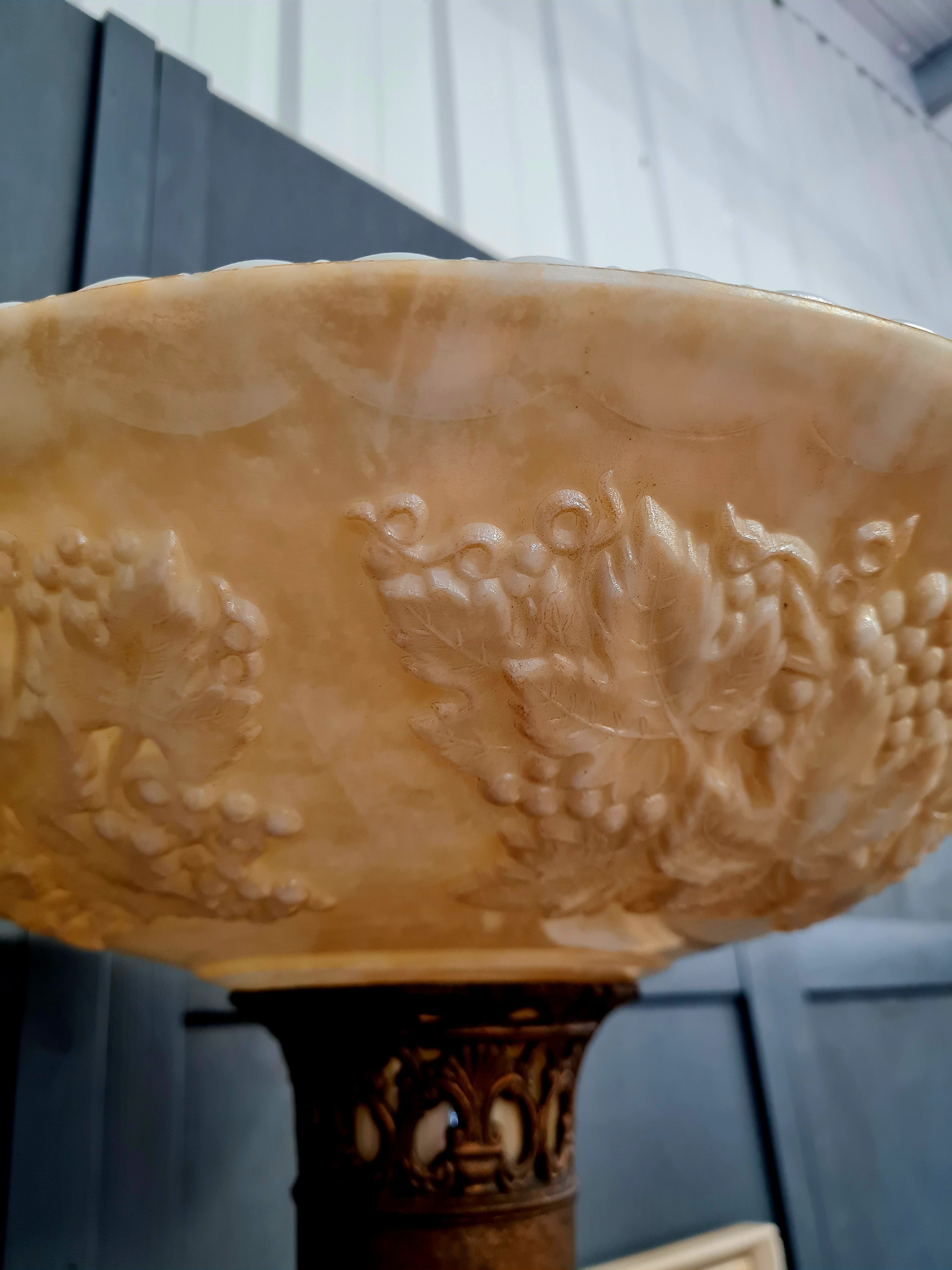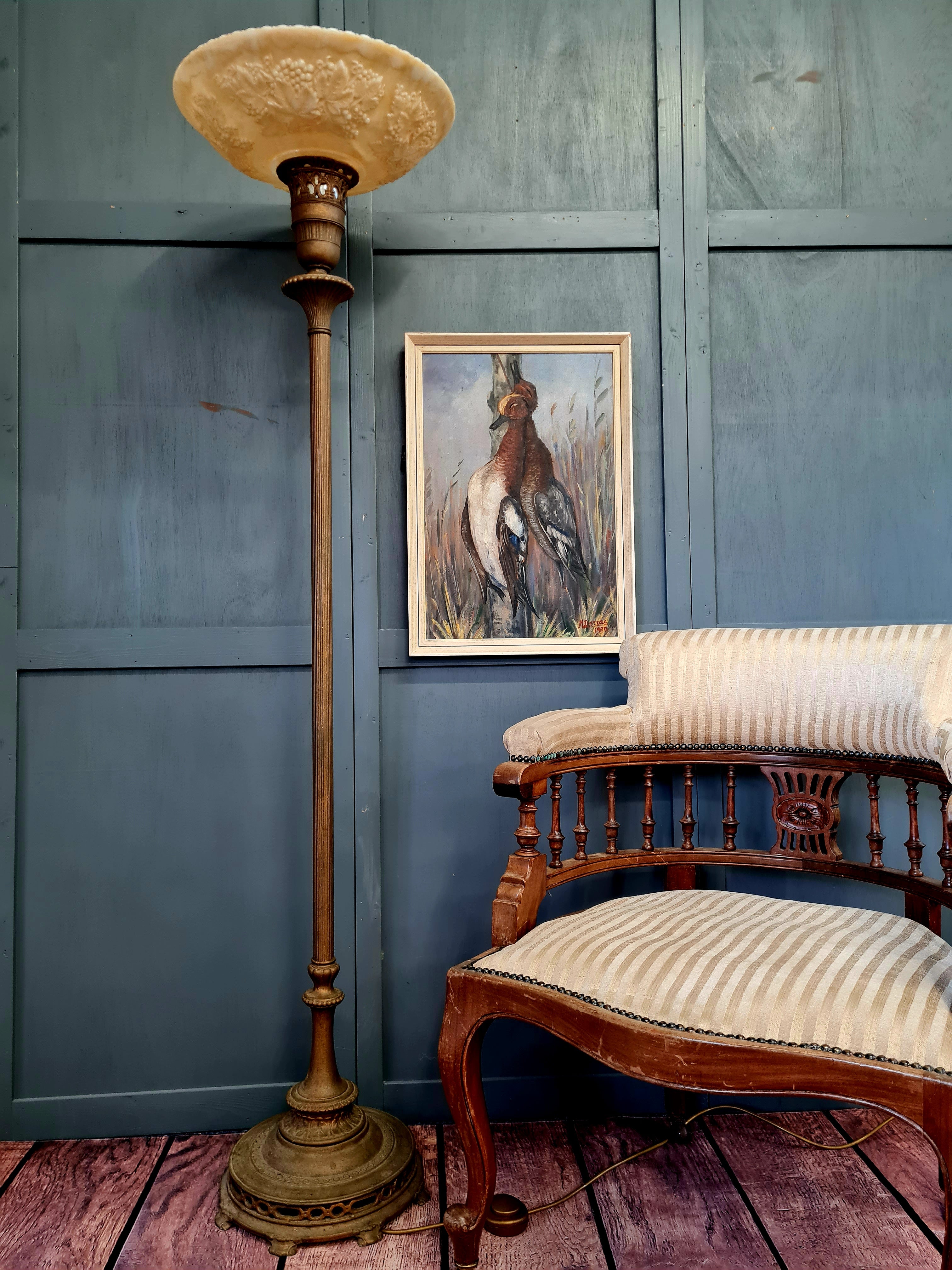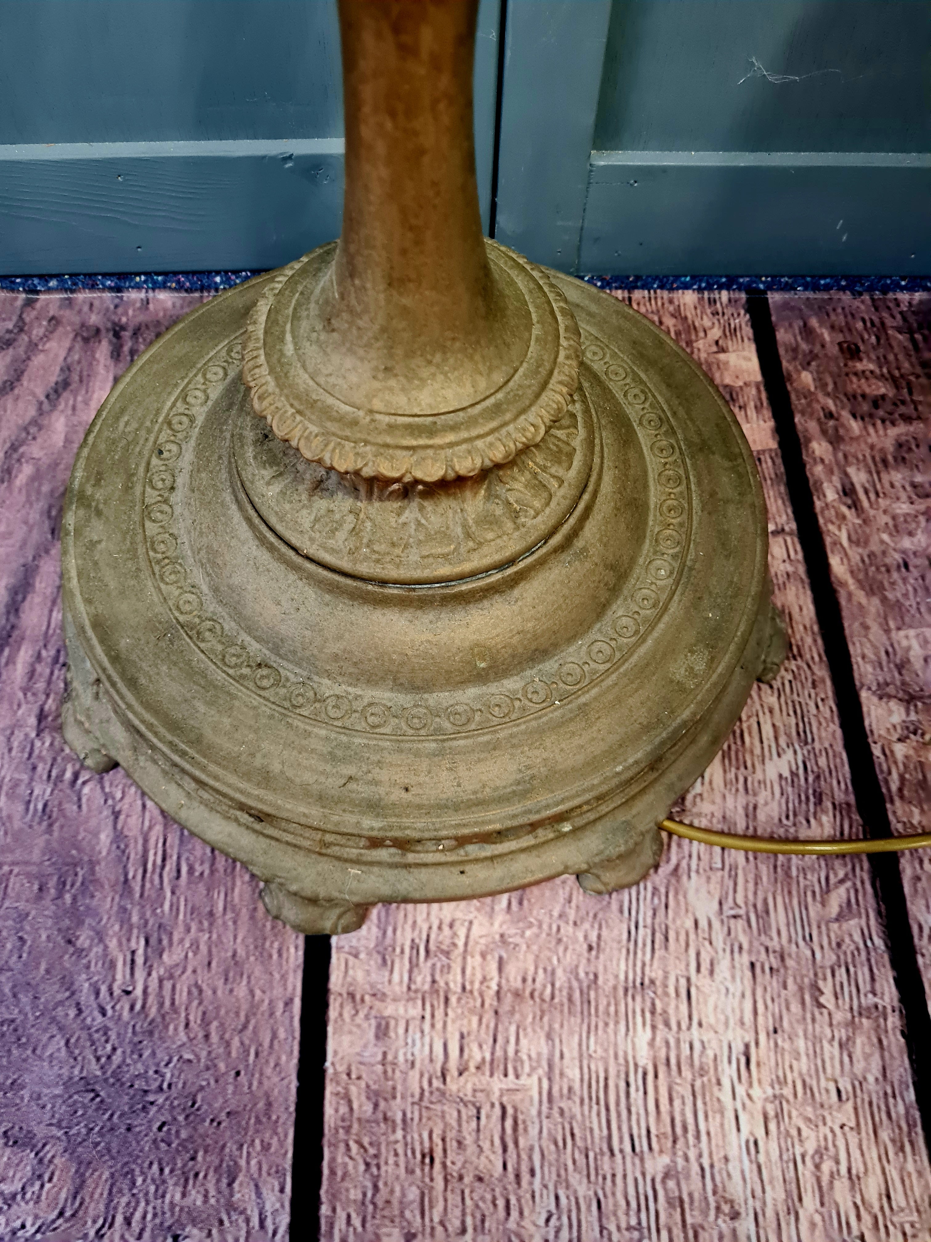 The lamp has a tall, slender column and weighted base made from cast metal with a brass or bronze-toned finish, giving it both stability and classic visual warmth. The combination of ornate pressed glass and structured metalwork bridges Art Nouveau and Art Deco influences, making it a versatile statement piece.
