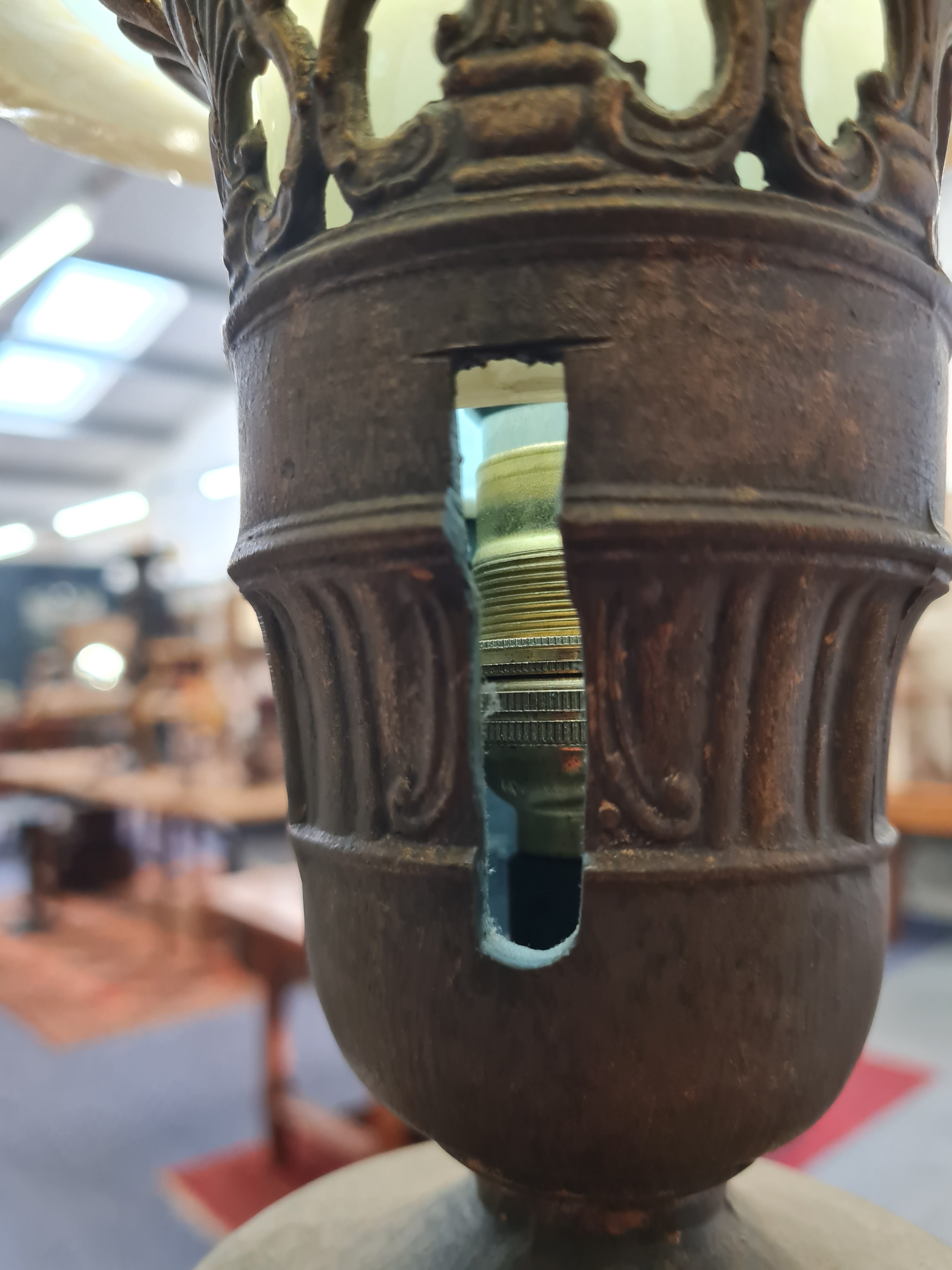 Likely dating to the 1950s–1960s, this lamp works wonderfully in vintage, traditional, eclectic, or mid-century interiors and provides excellent ambient lighting. The original switched lamp holder has been replaced leaving a slot where the switch would have been(pictured), new footswitch fitted and PAT tested.